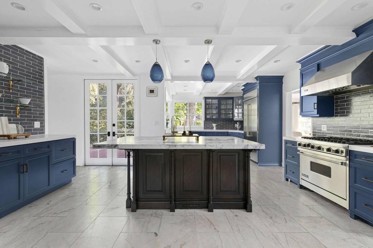 Prostorné kuchyni vládne elegantní modrobílá kombinace barev.