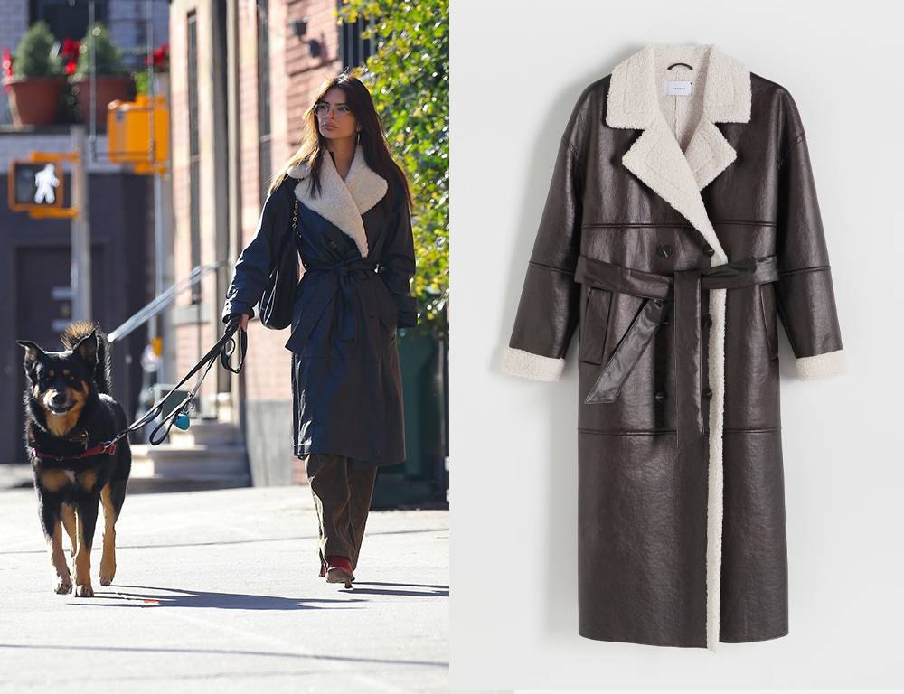 Modelka Emily Ratajkowski byla v minulých týdnech vyfocena v koženém kabátku s beránkem od značky Loewe, ke kterému se vrací už pátým rokem. A my víme, kde najdete obdobný. Vpravo: Kabát Reserved, 1 299 Kč (před slevou 2 399 Kč)