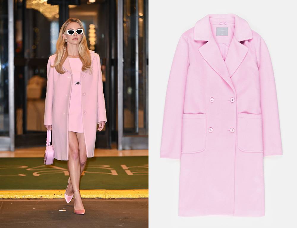 Herečka Sydney Sweeney je jednou z nejlépe oblékaných hvězd své generace a v roce 2023 mnohokrát ohromila. Vydařený je i její dva týdny starý look složený z pastelově růžových kousků. Přes šaty Versace si oblékla kabát Kate Spade, který vyšel na necelých dvacet tisíc korun, svršek v podobném stylu ale najdete i v řetězcích. Vpravo: Kabát Gate, 998 Kč (před slevou 1 398 Kč)