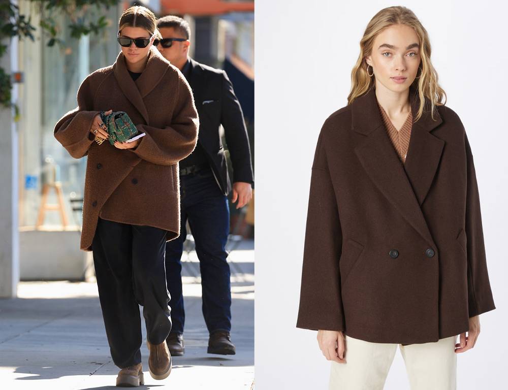 Sofia Richie Grainge, dcera hudebníka Lionela Richieho, tráví zimu v minimalistickém kabátě značky The Row v krásném čokoládovém odstínu. Vpravo: Kabátek Lindex, 1 499 Kč, prodává About You