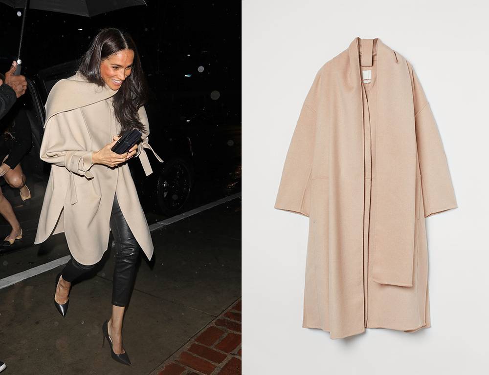 Do oka nám padl i elegantní béžový kabát, do kterého se oblékla Meghan. Vévodkyně ze Sussexu ho má od návrhářky Caroliny Herrery, moderní model s šálou ale najdete i v běžném obchodě. Vpravo: Vlněný kabát H&M, 4 999 Kč