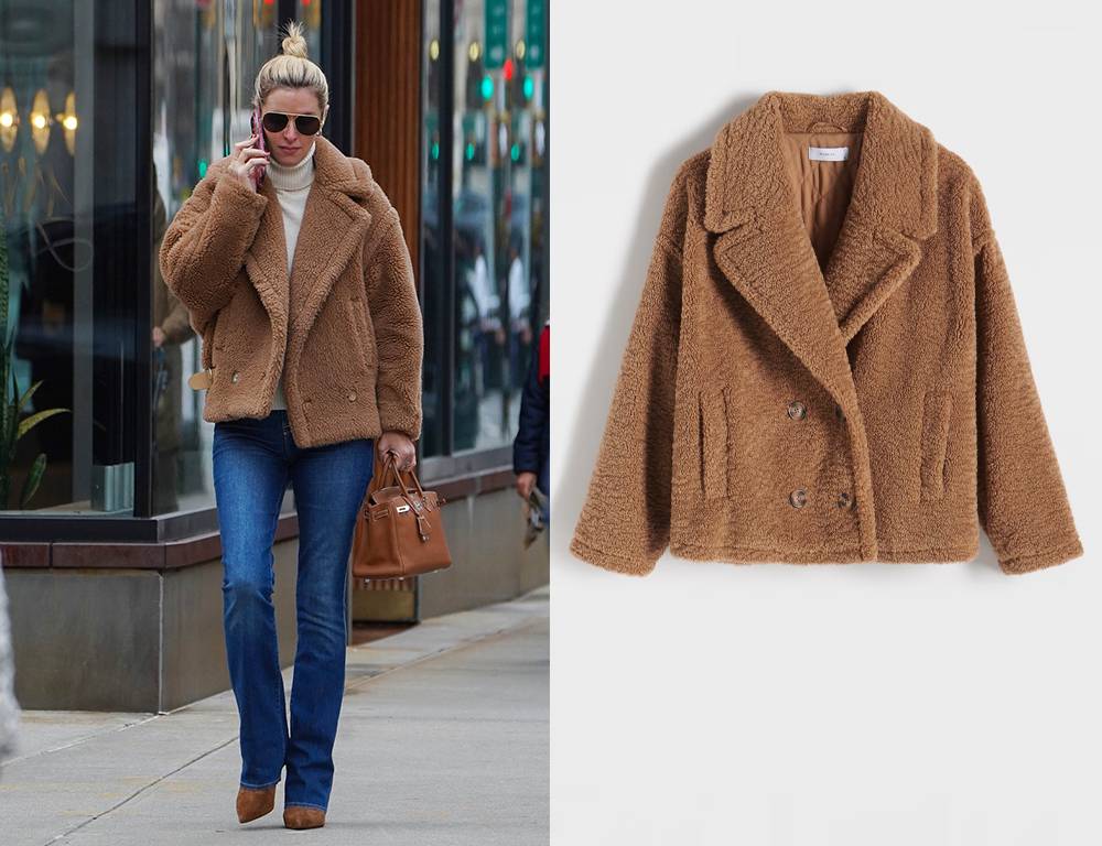 Huňaté teddy bear kabáty jsou letos in a na kom jiném je hledat než na Nicky Hilton. Právě ona patří k jejich největším fanynkám a nosí je bez ohledu na to, jestli jsou v kurzu, nebo zrovna bodují jejich konkurenti. Má jich hned několik, a to jak dlouhých, tak i kratších do pasu. Vpravo: Kabátek Reserved, 899 Kč (před slevou 1 399 Kč)