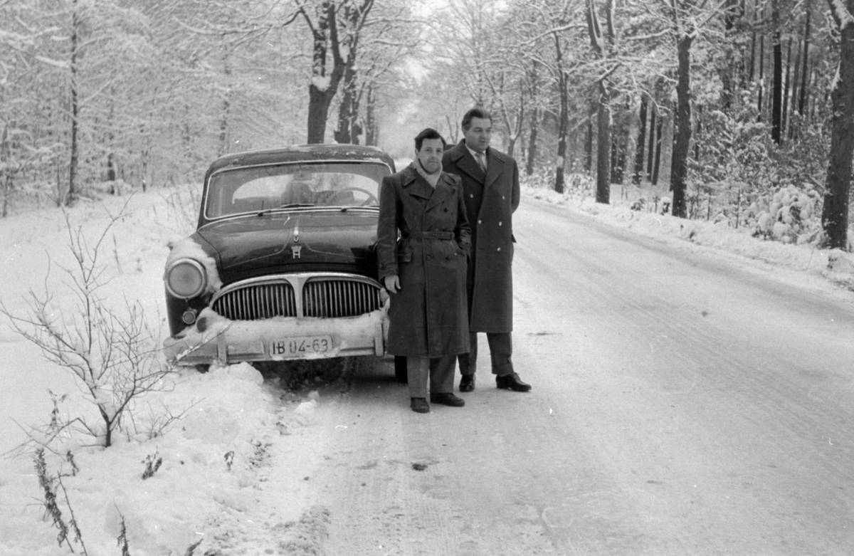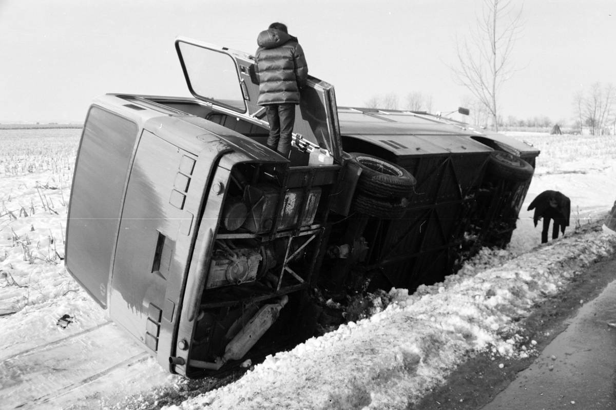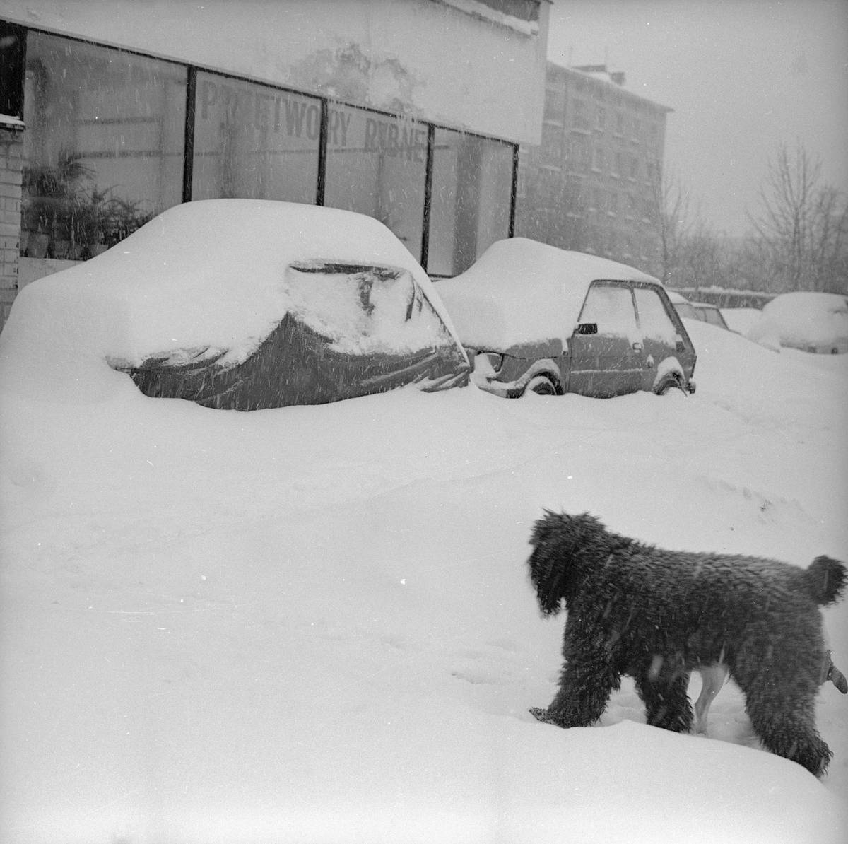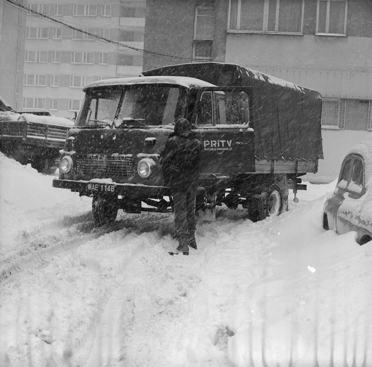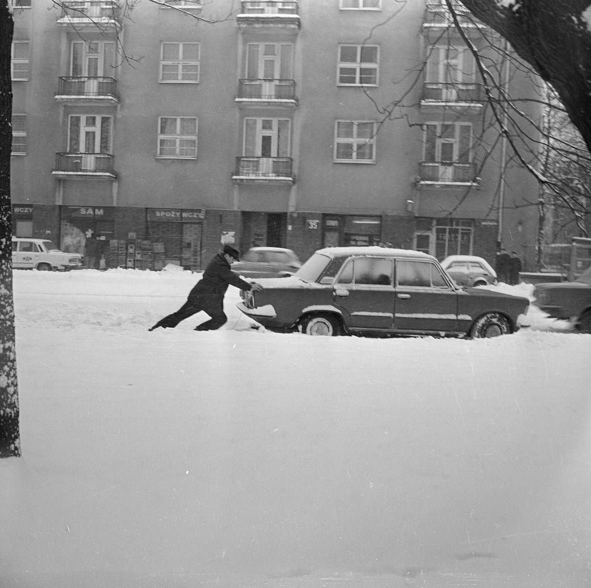 Motor vpředu a pohon zadních kol na zasněžené silnici. Kombinace, která přinášela řidičům mnoho problémů, jak dokazují Volha 21 nebo Polski Fiat 125p na tomto snímku.