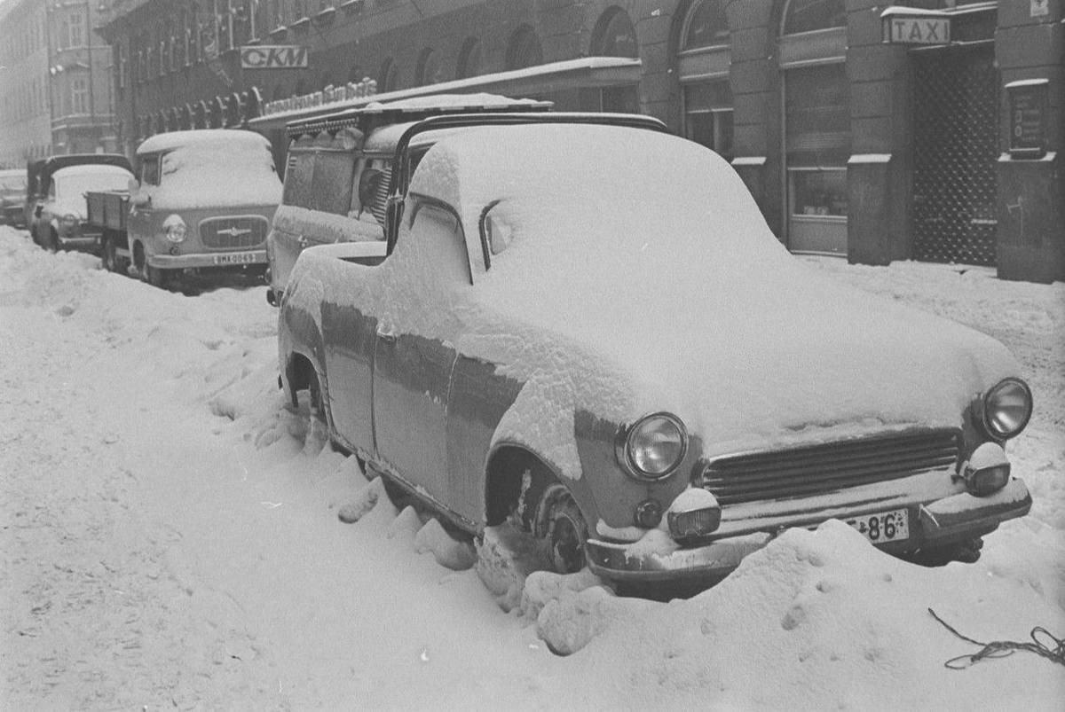 Tady se pod závějí pro změnu ukrývá jiné polské lidové auto, Syrena, která se do Československa nedovážela. Pro polské zákazníky se ale stala legendou, přirovnat by se dala třeba ke Škodě 1000 MB.