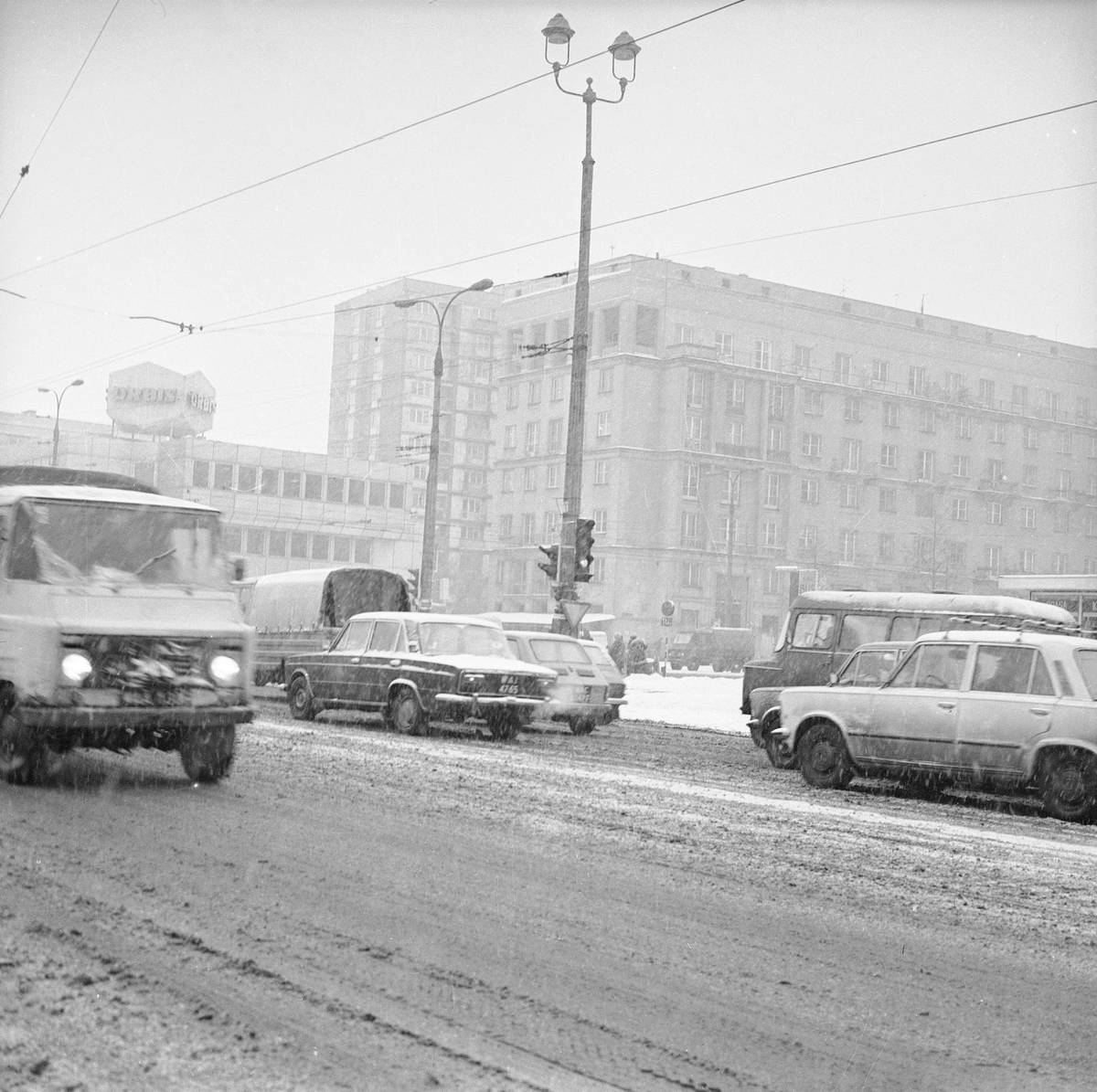 A Varšava ještě potřetí, tentokrát počátkem 80. let a viditelná změna vozového parku. V popředí dodávka Žuk, dále třeba Fiaty 125p nebo žigulíky.