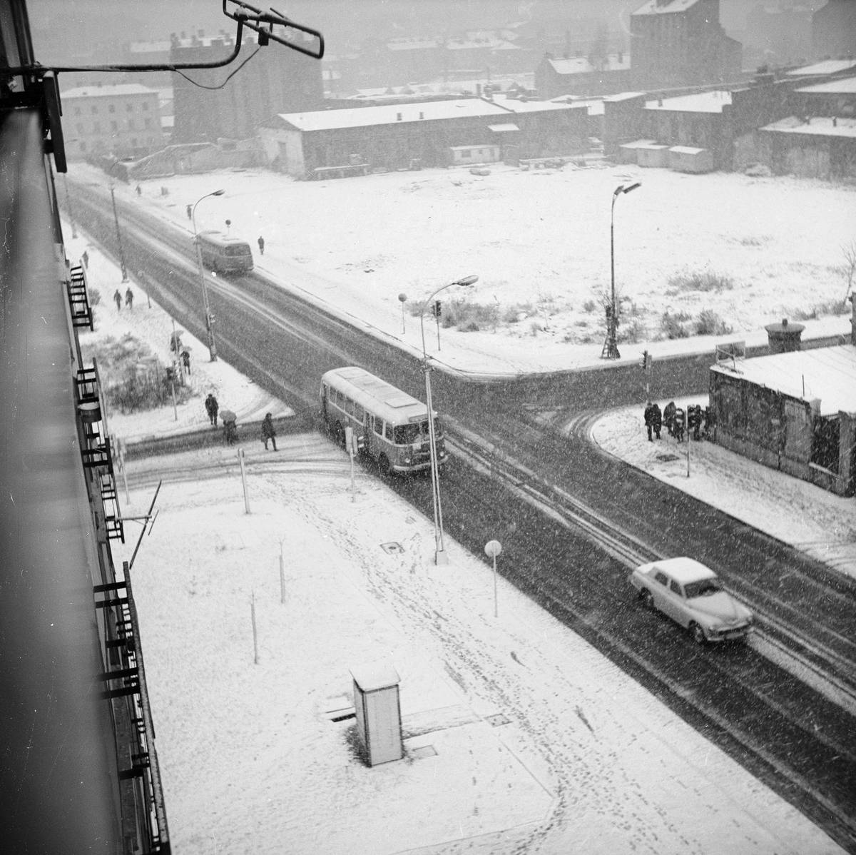Přelom 60. a 70. let ve Varšavě, na prakticky prázdné silnici si všimněte třeba automobilu Warszawa 223.