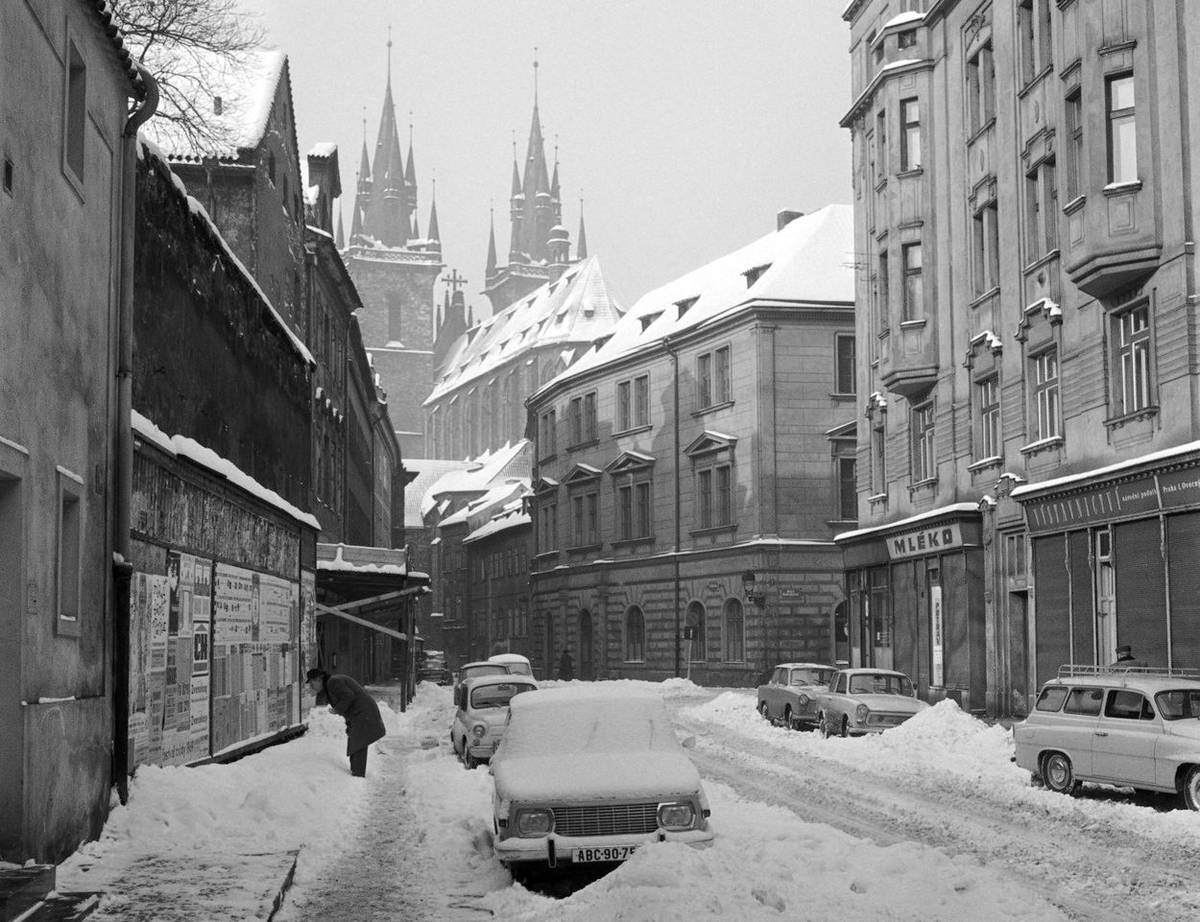 Záběr z února 1969 na Štupartskou ulici v Praze. Jistě identifikujete třeba zasněžený Wartburg 353.