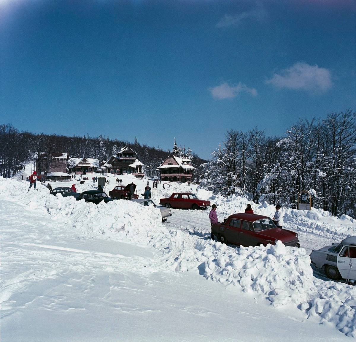 Zatímco v Brně měli začátkem roku 1970 se sněhem co dělat, v Beskydech byl jeho přísun vítán. V pozadí vidíte chaty Libušín a Maměnka.