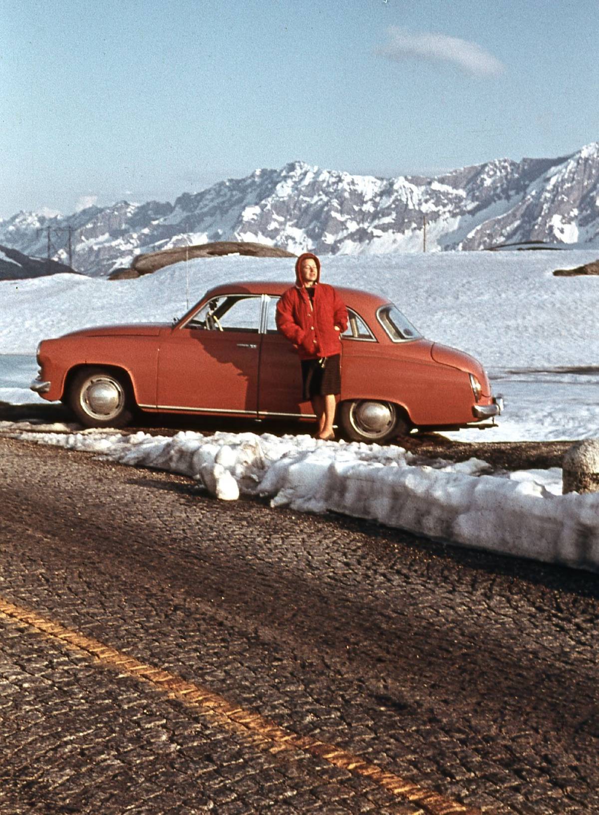 Sníh ale neznamená jen kalamitu a problémy, může se stát také vítaným pozadím pro fotku do rodinného alba. Jako to nejspíše udělali majitelé červeného Wartburgu 311.