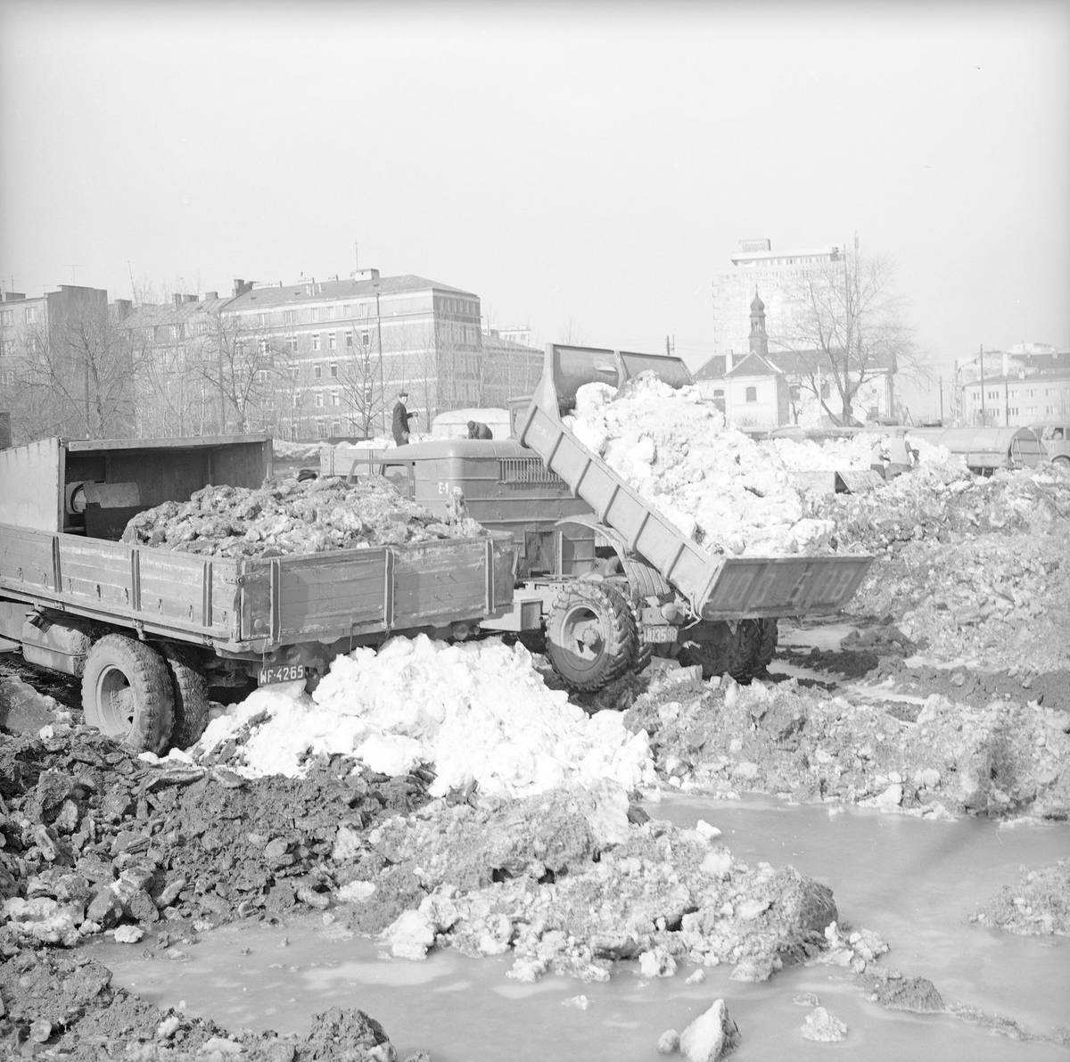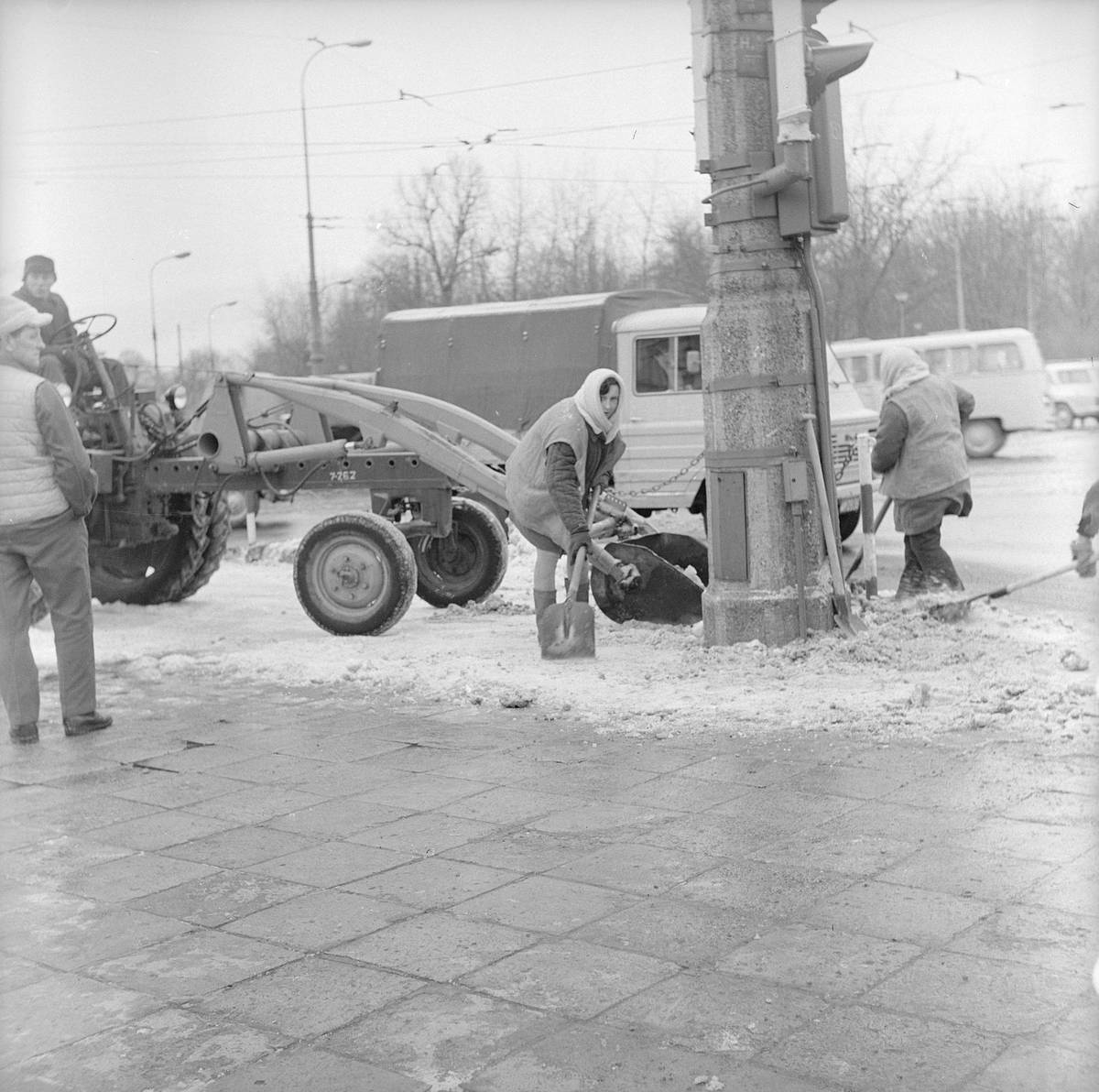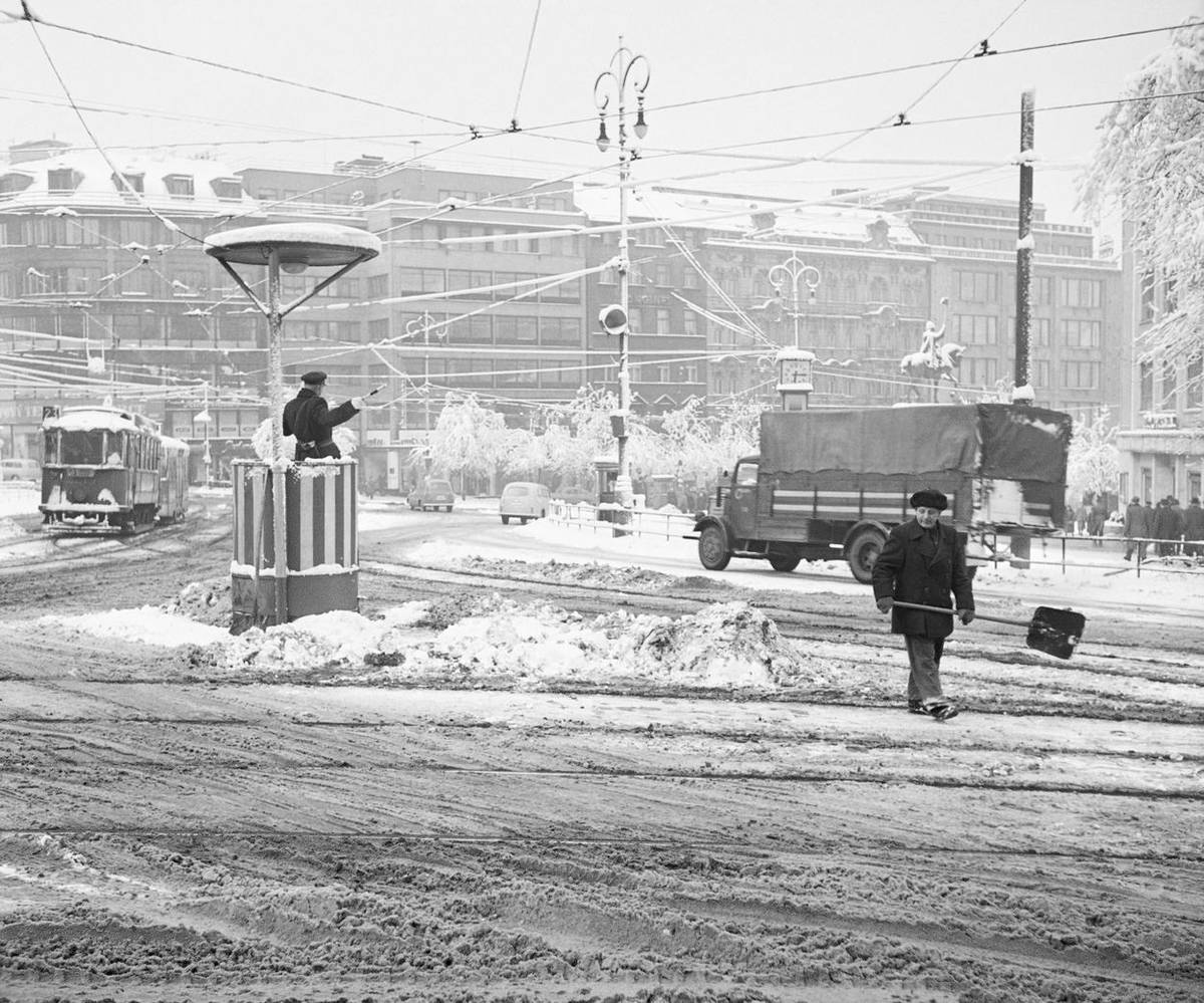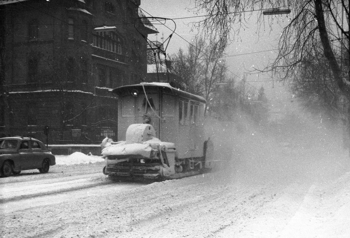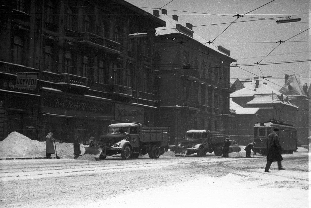 Speciální technika musela pomoci i tramvajím, tady snímek z Budapešti z roku 1963.
