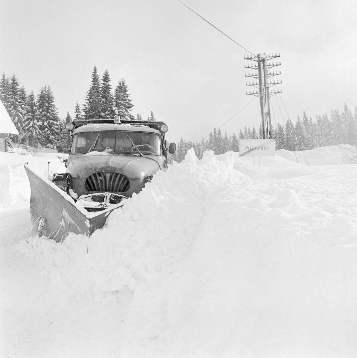 Typičtější ale byly pro socialistické cestáře pluhy připojené třeba k Tatře 138. Tady se snaží odklidit silnici na Modravě.