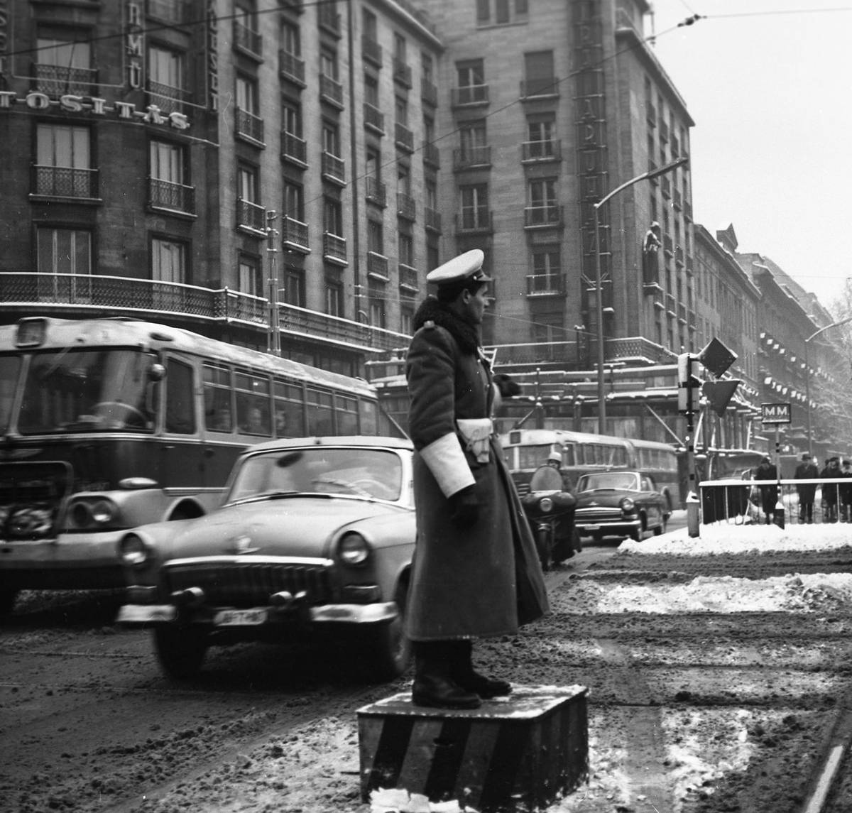 Stejná situace, jen o osm let později v Budapešti. Dopravu tu v jednom chladném zimním dni také musí řídit policisté.
