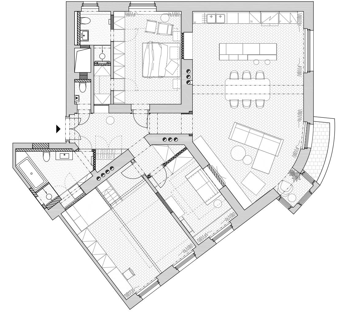 „V interiérech máme rádi ucelené plochy jako zdi obložené dřevem se skrytými průchody nebo průchozí skříně z koupelen do ložnic,“ prozrazuje architekt.