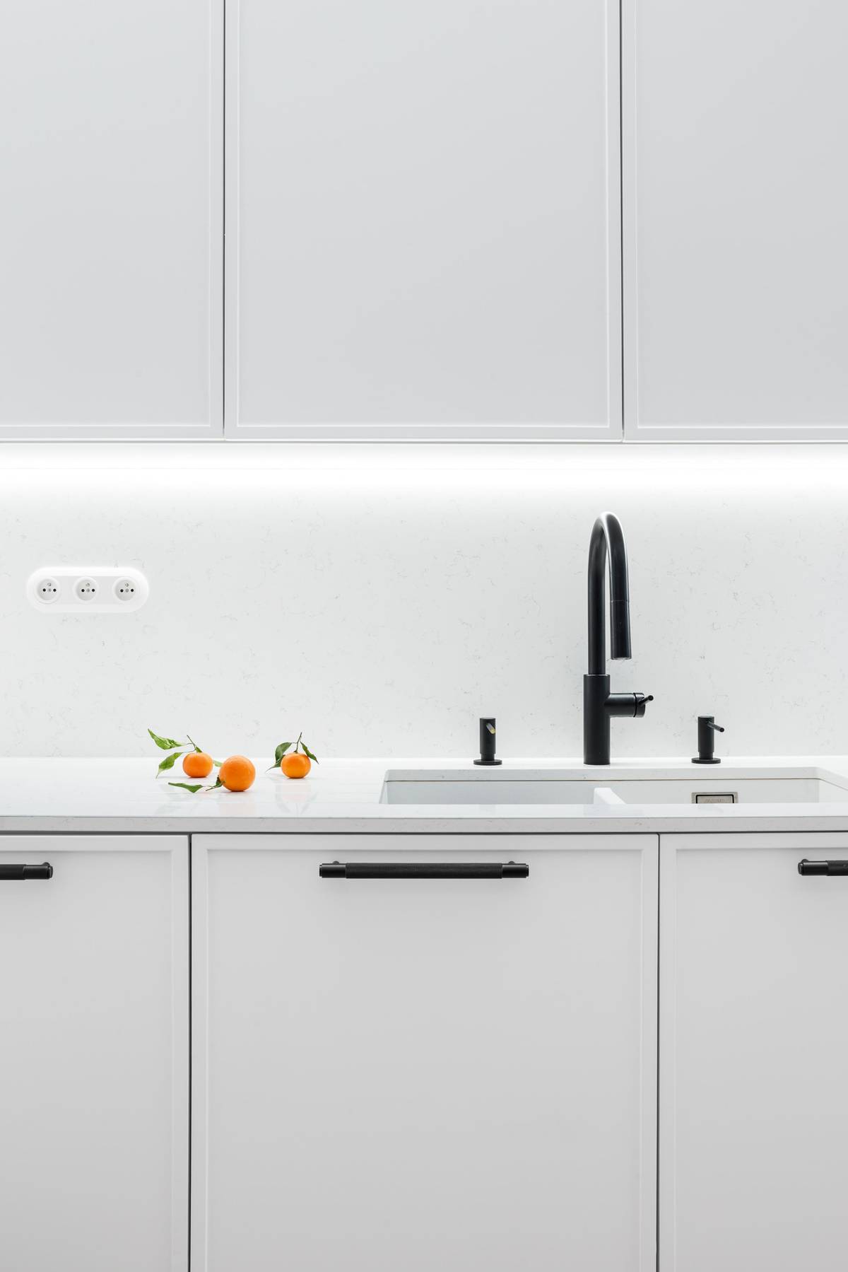 Horní skříňky kuchyně jsou řešeny bezúchytkově, spodní mají černá podlouhlá madla.