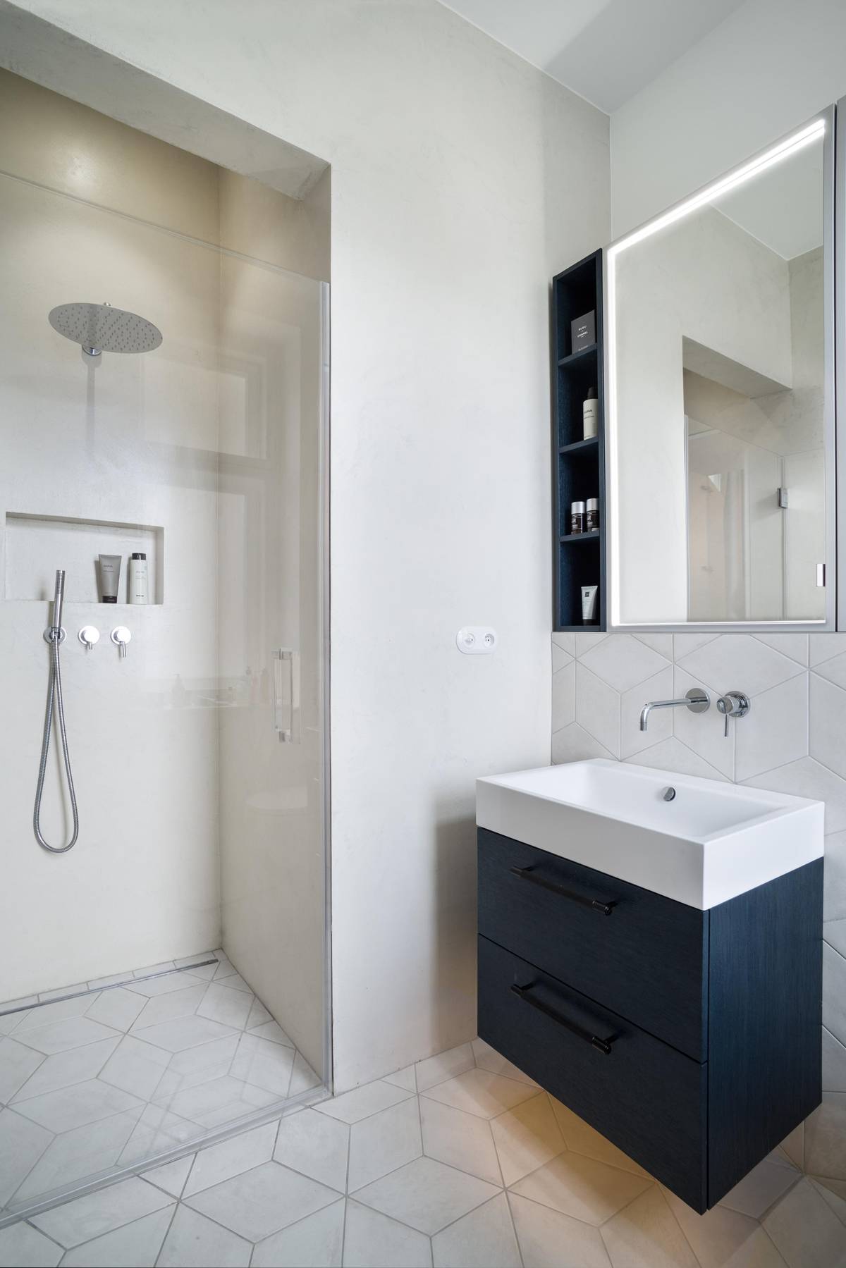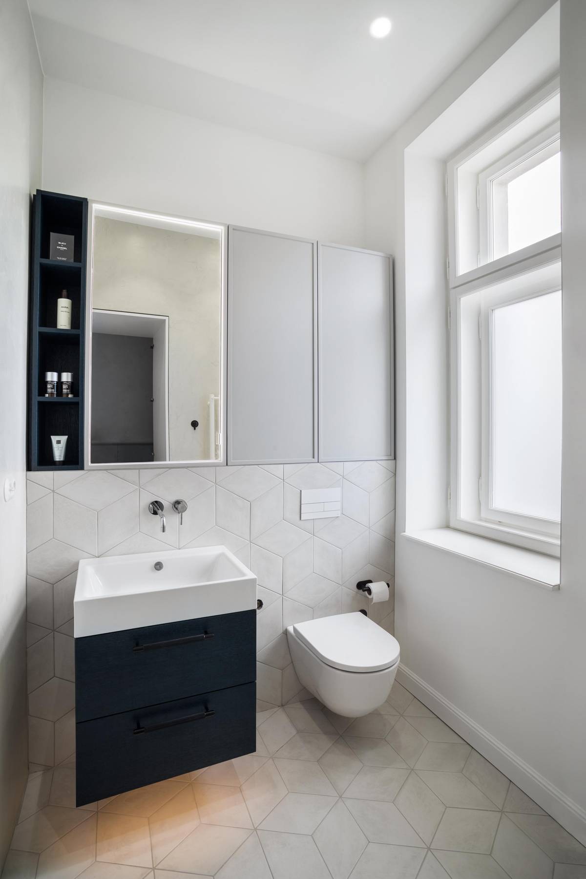 Tmavě modrá je v koupelnách zastoupena úložnými prostory.