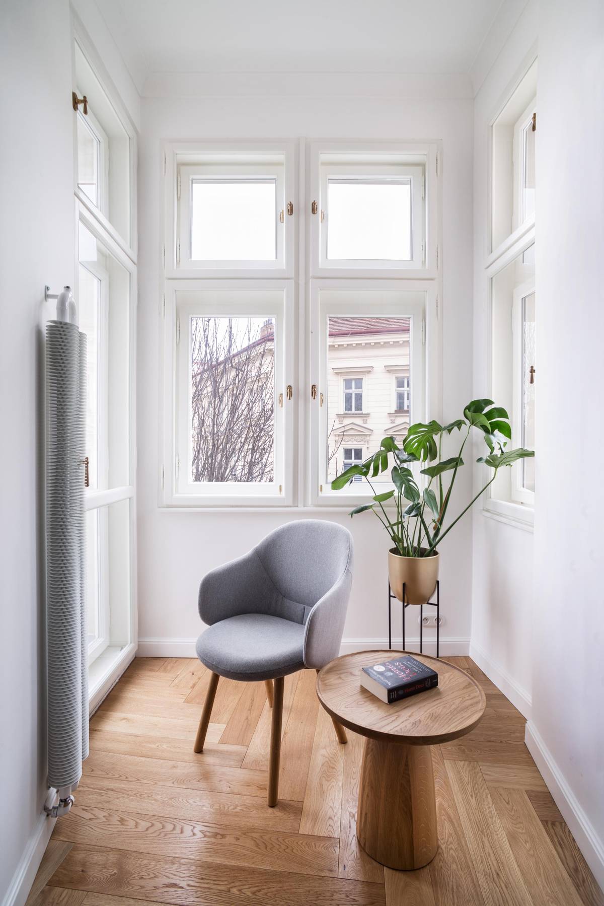 V bytě je příjemná dřevěná podlaha.