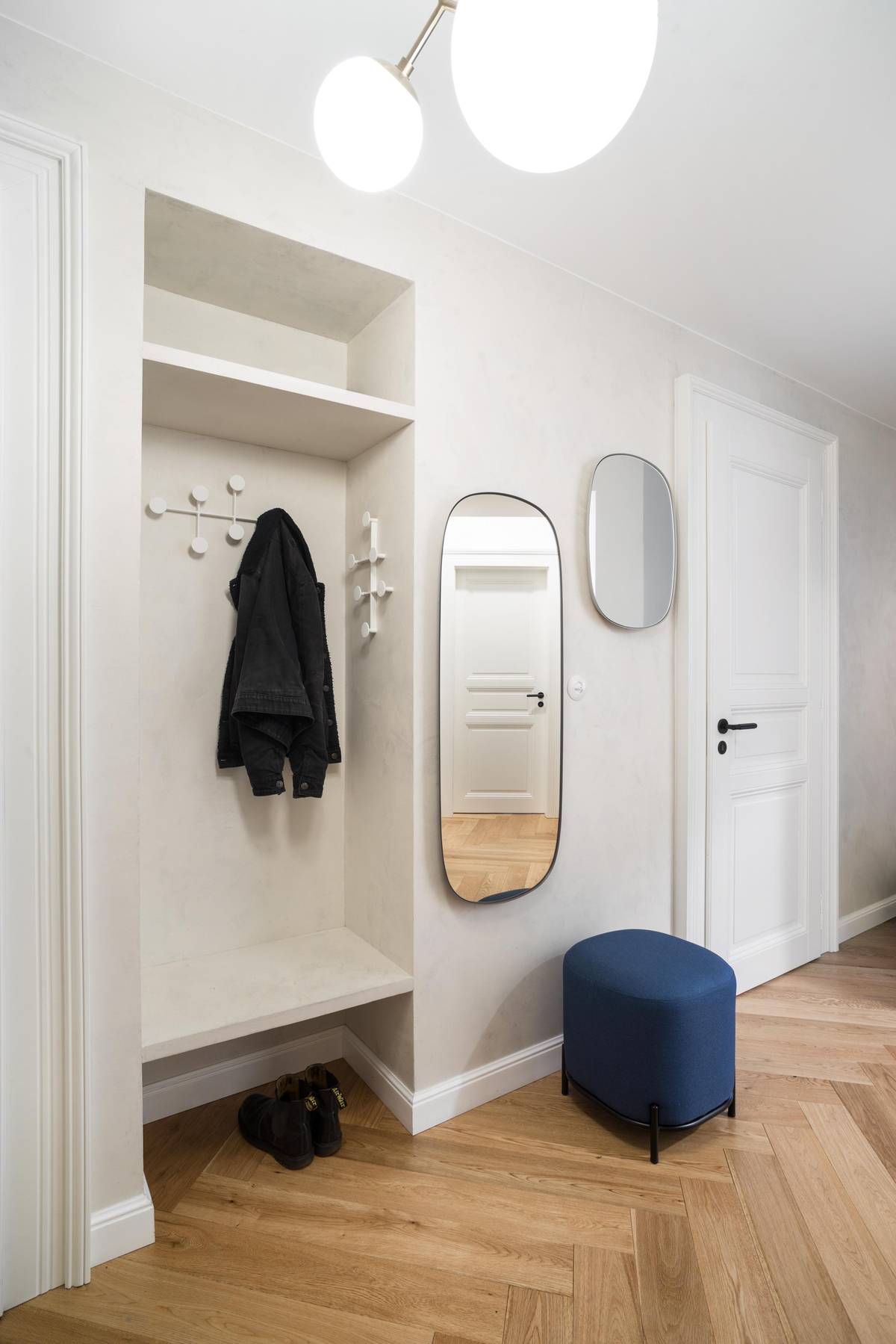Oblé tvary typické pro předsíň dodržuje i taburet v tmavomodré barvě.