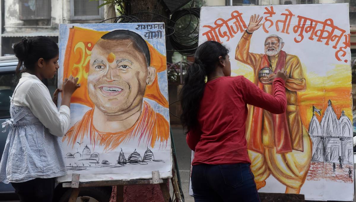 Studenti malují před slavnostním dnem výzdobu v ulicích Ajódhjy. Portrét premiéra Módího a premiéra státu Uttarpradéš Yogiho Adityanatha, který je zároveň hinduistickým mnichem.