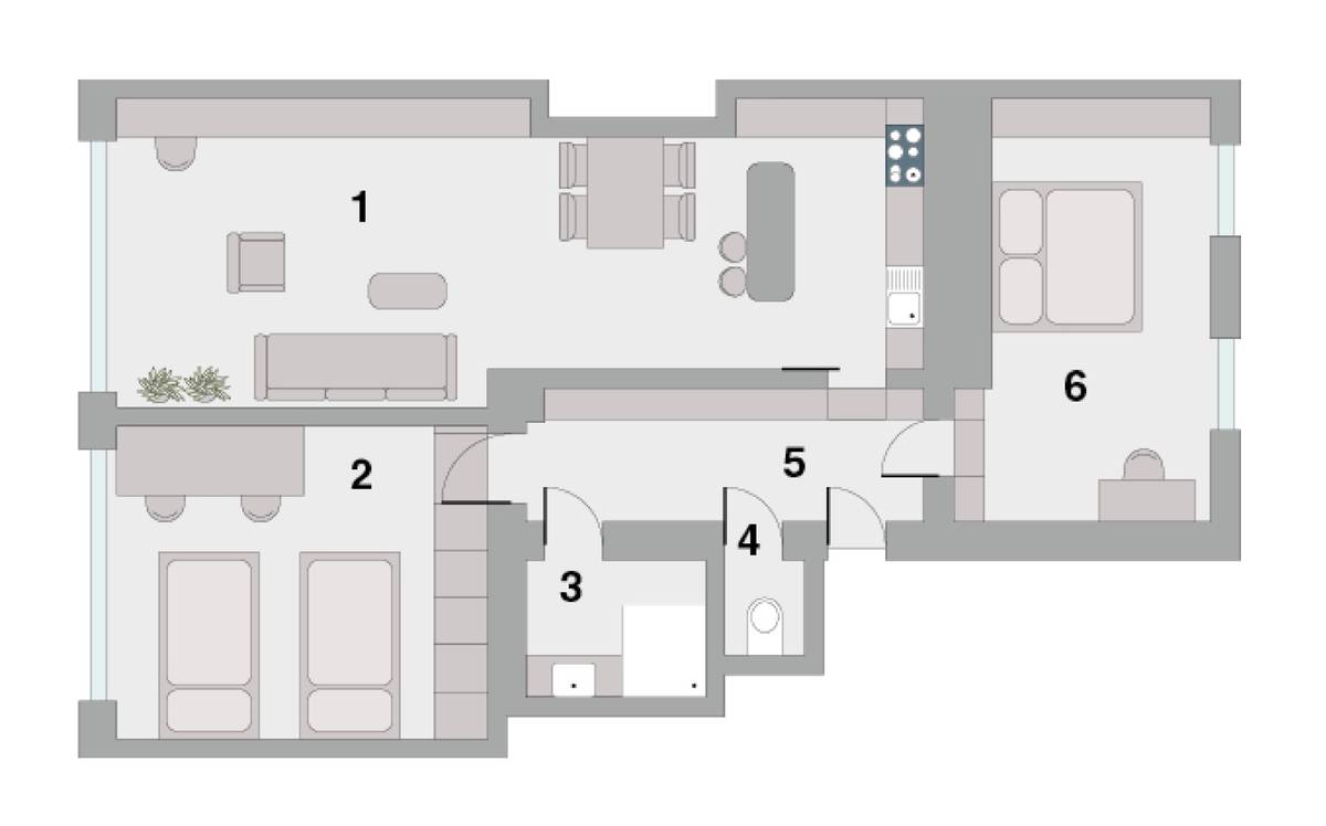 Půdorys: 1 obývací prostor s kuchyňskou částí a jídelním stolem, 2 dětský pokoj, 3 koupelna, 4 toaleta, 5 vstupní chodba, 6 hlavní ložnice