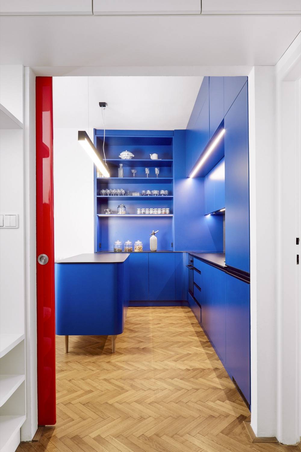 Červená barva dveří dobře ladí s tmavomodrou barvou kuchyně.
