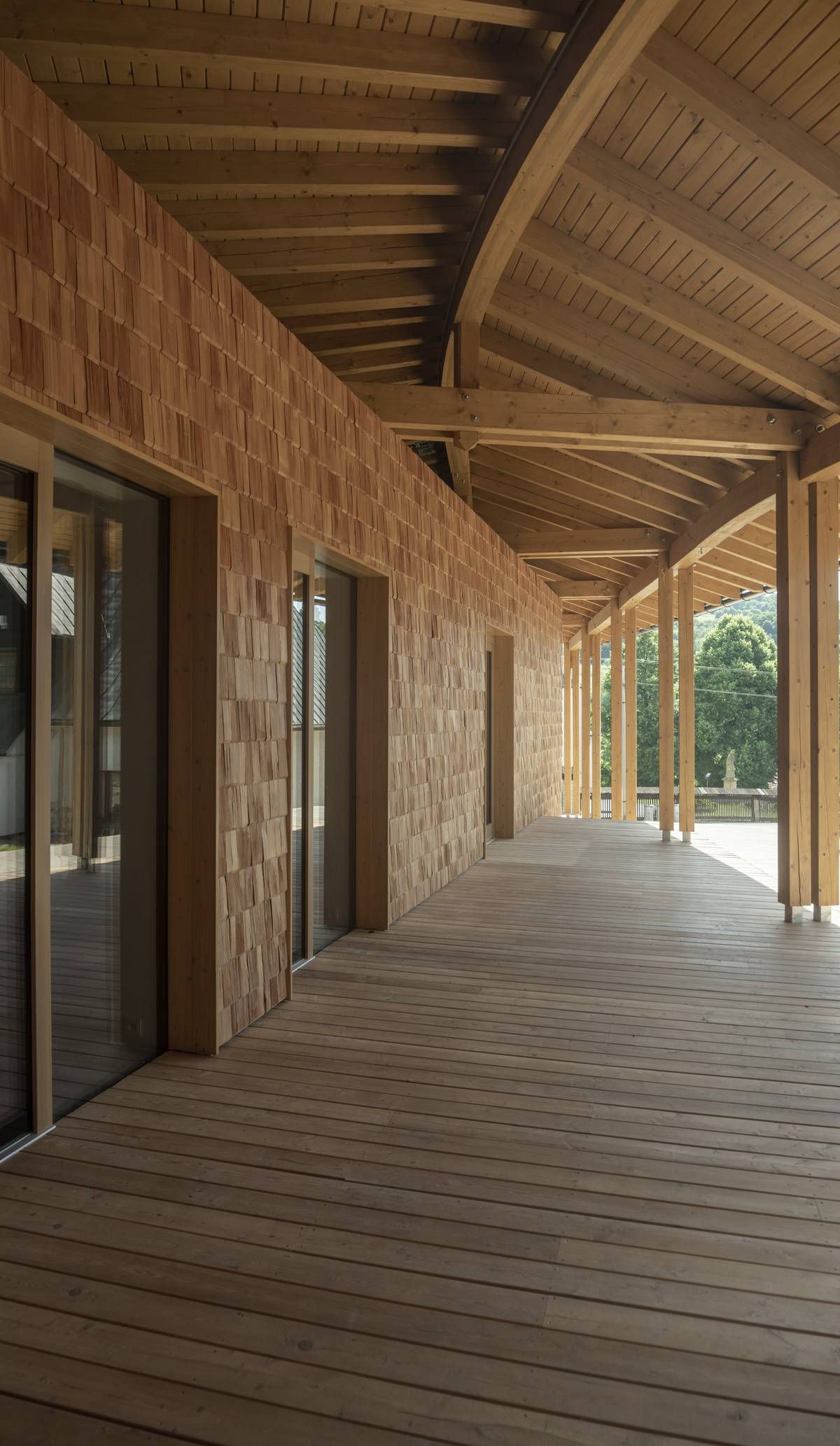 Stavbě vévodí dřevěný obklad.