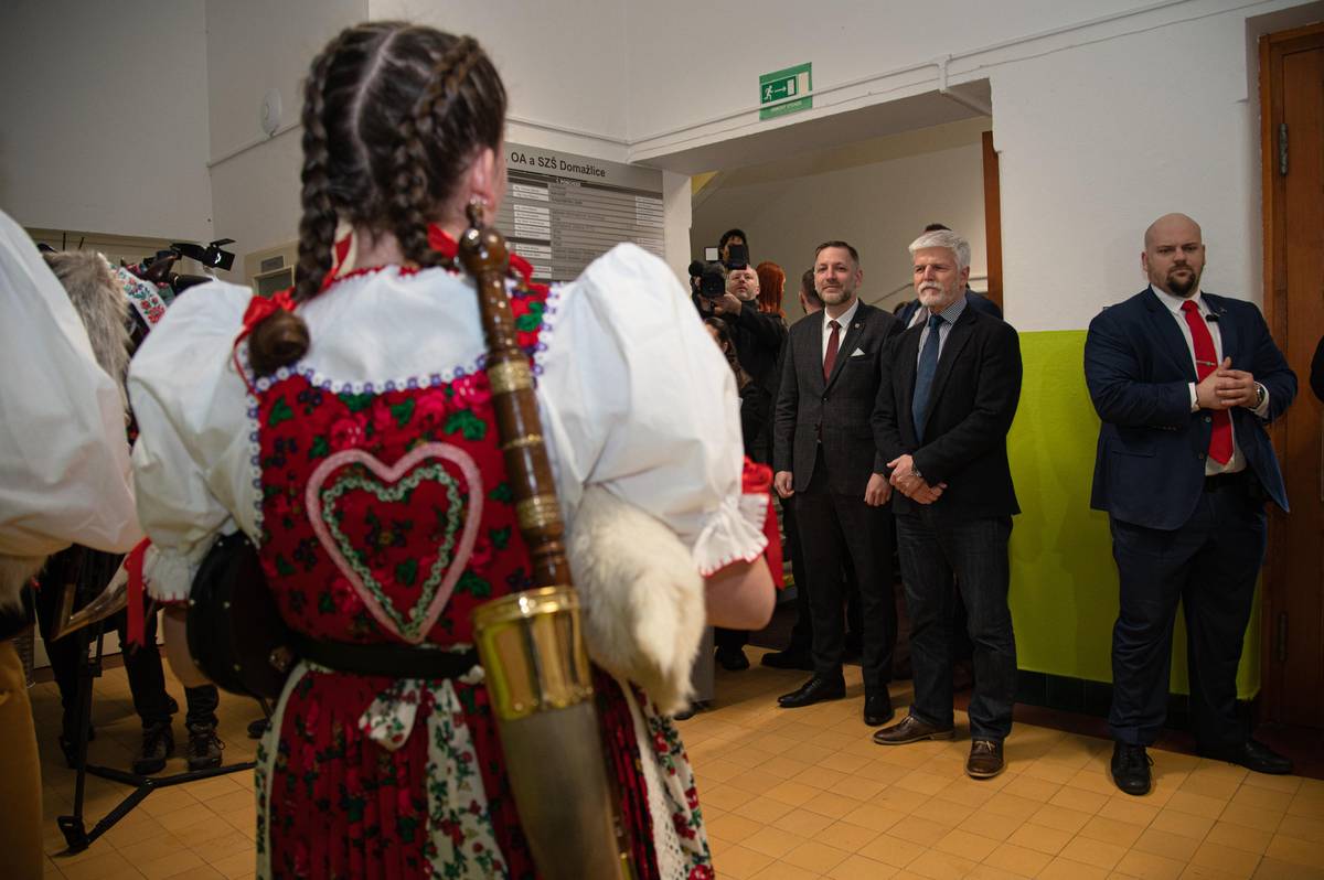 V místní střední škole ho přivítali dvěma tradičním písněmi studentky a bývalí studenti v chodských krojích. Studenti zahráli na dudy a vozembouch. Na snímku Kateřina Faloutová, Hynek Hradecký, Hana Ježková a Patrik Hradecký