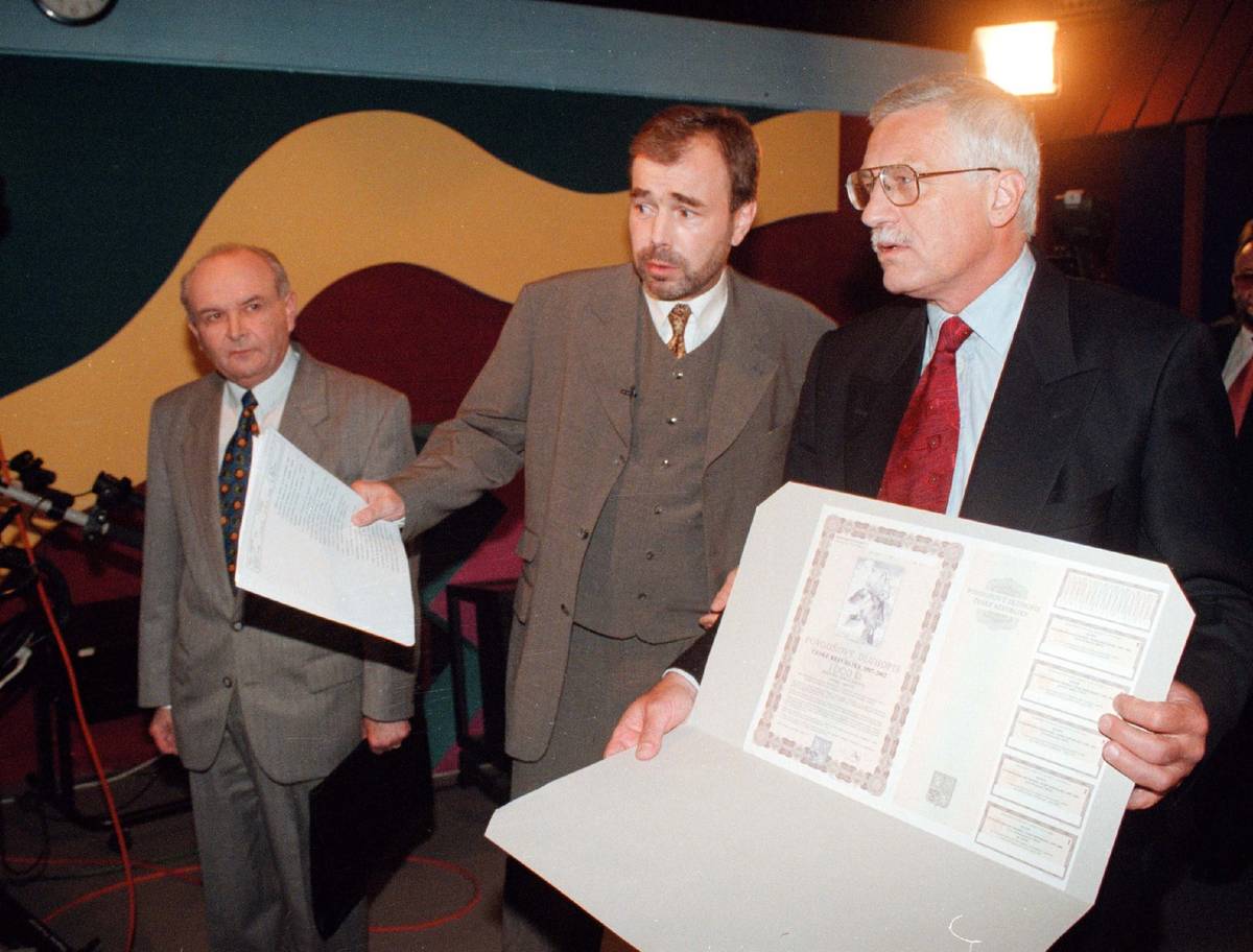 Původní novácká politická debata, nasazovaná ve stejný čas jako veřejnoprávní konkurenční pořad, se jmenovala 7 čili sedm dní. Prvním moderátorem pořadu byl Jan Vávra (zde na snímku mezi tehdejším nezařazeným poslancem Jozefem Wagnerem (vlevo) a premiérem Václavem Klausem). Po Vávrovi do moderátorského křesla usedli Jana Bobošíková, Michaela Jílková, Martin Veselovský a Jitka Obzinová. Fotografie pochází z července 1997, Klaus tehdy ukazoval povodňový dluhopis.