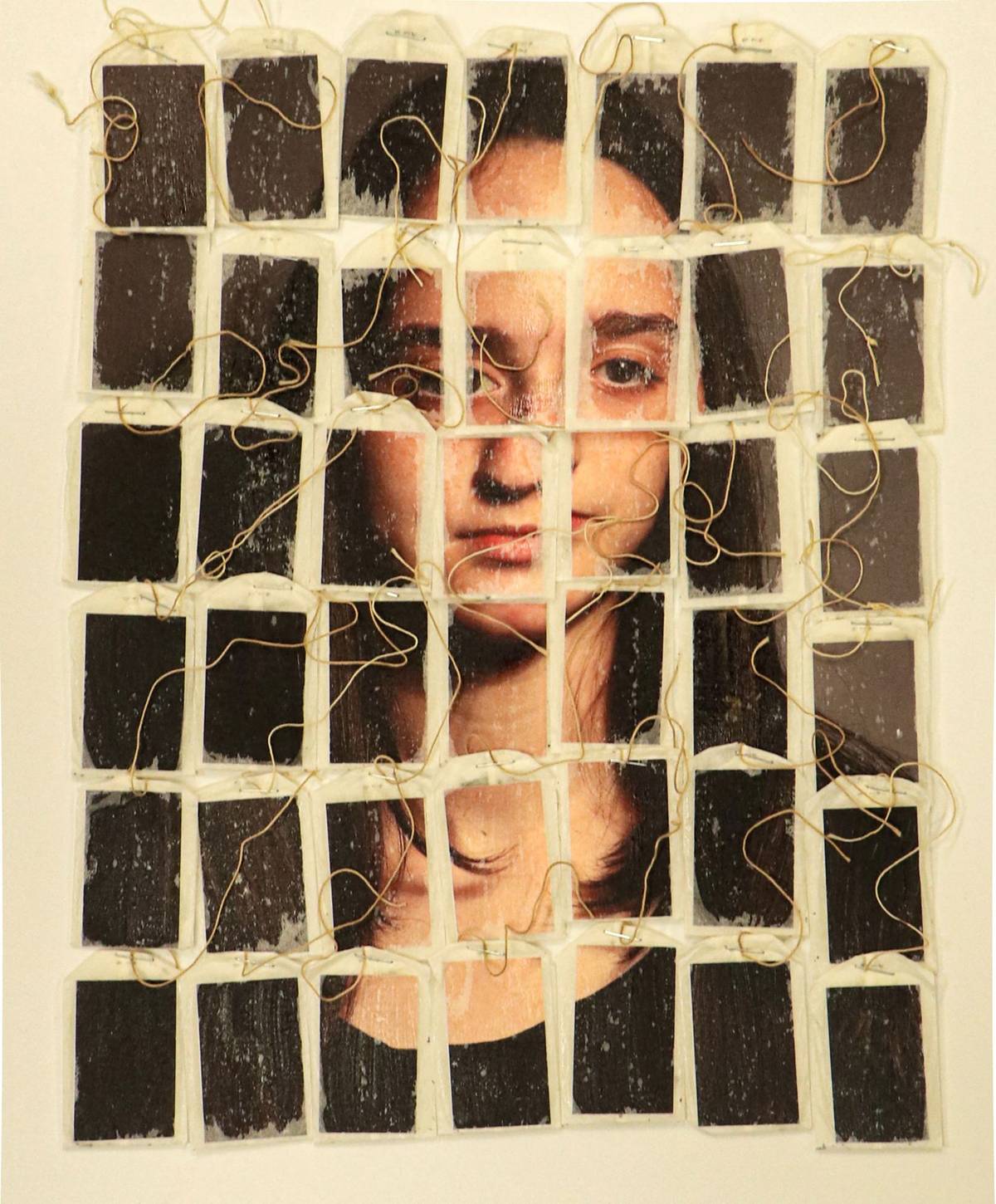 Shayna Cuencaová (USA): Portrét v čajových sáčcích (autoportrét rozstříhaný na kousky a vložený do čajových sáčků). Finalistka v kategorii Mládež.