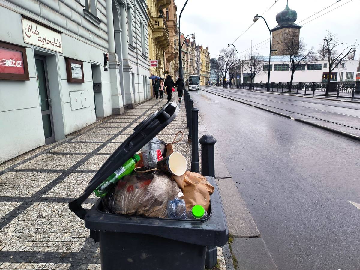 Když na Masarykově nábřeží v Praze 1 popeláři vyvážejí odpadky, automobilová doprava se zastaví.