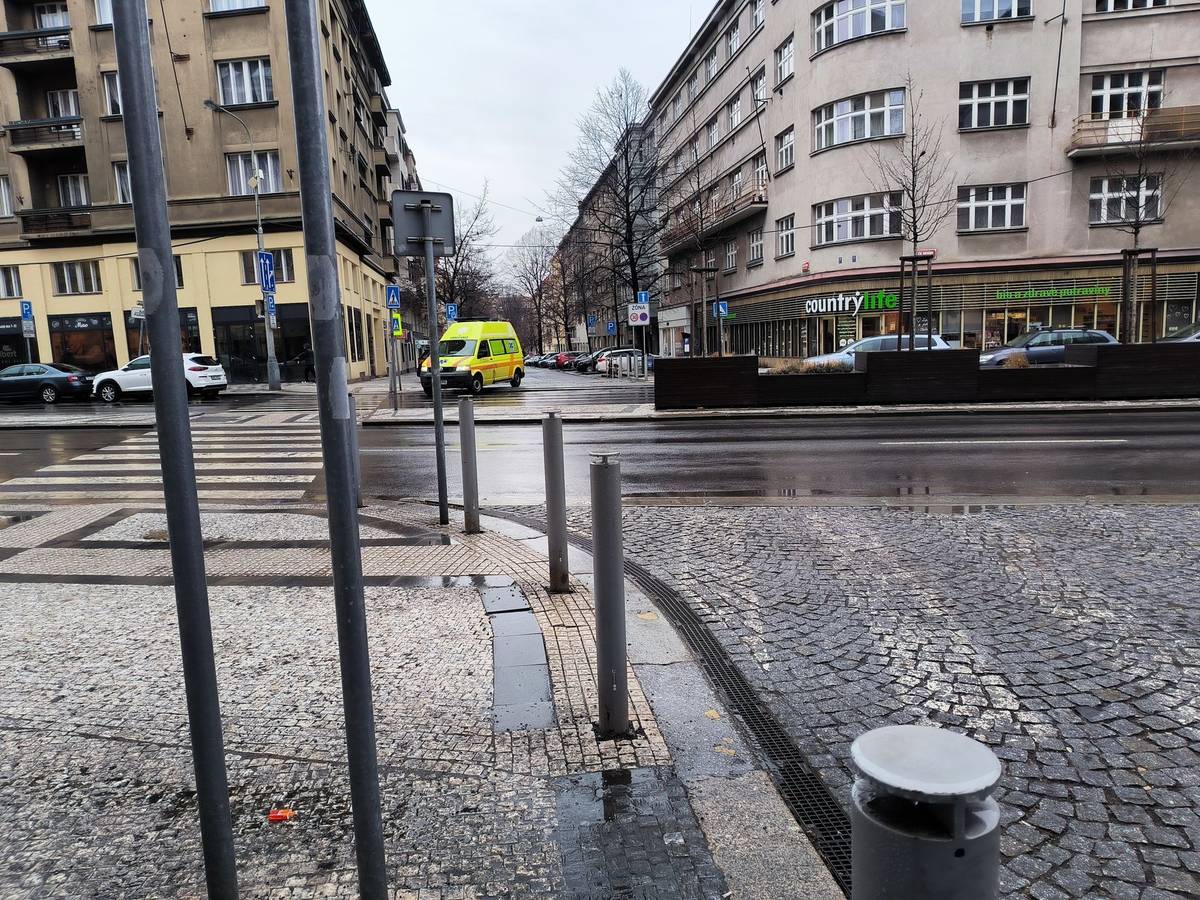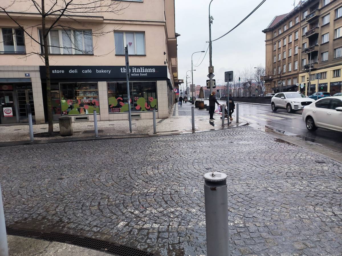 Během naší přítomnosti na chodníku nestál nikdo až na auto komunálních služeb. To sem ovšem zajelo i skrze instalované sloupky.