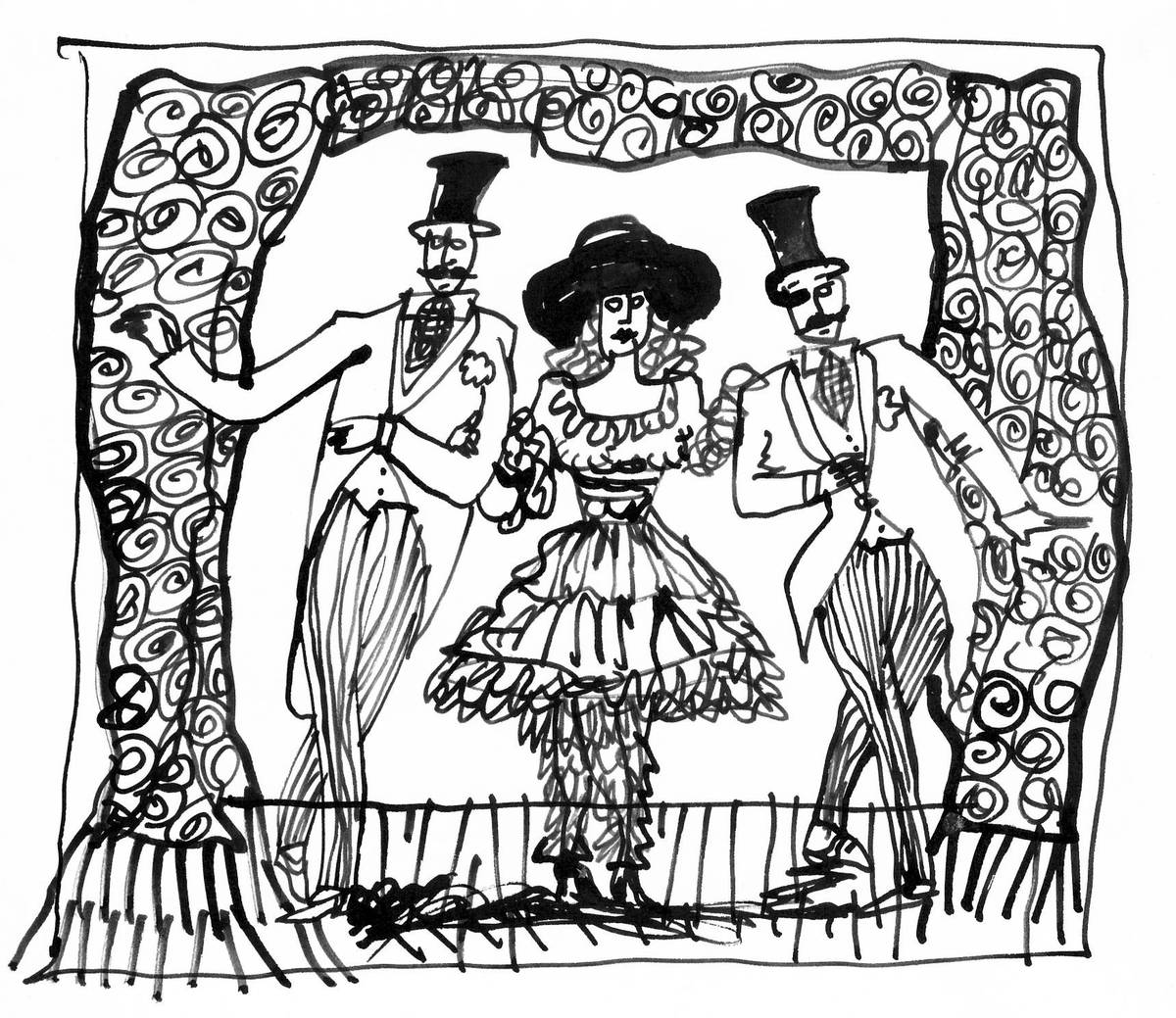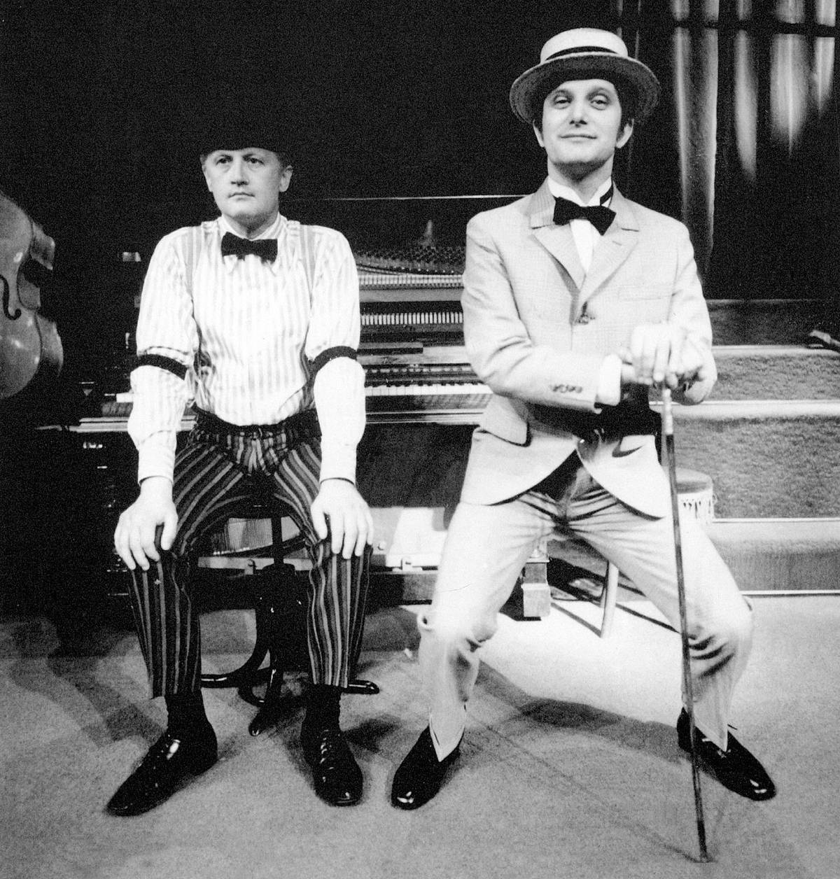 Ve dvojici se Šlitrem tehdy napůl z nouze, napůl natruc vytvořili komorní revui. V ní se zrodila Suchého nejznámější postava, skládající poctu zapomenutým zpěvákům vaudevillových divadel a kabaretů. A na jeviště se také v černé buřince, s červenými kšandami, poprvé před mikrofon jako komik odvážil skladatel a klavírista Šlitr.
