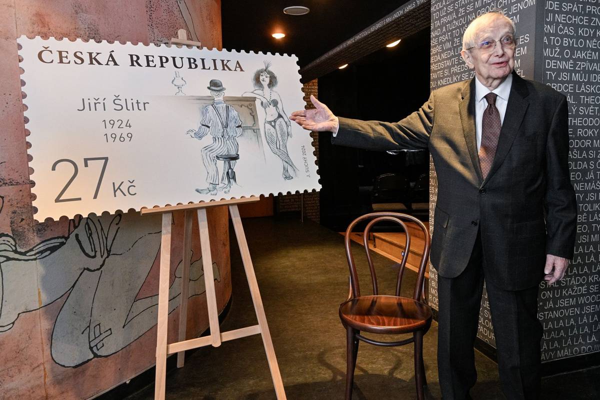 Šlitra nově připomíná poštovní známka s motivem umělce sedícího u pianina, o které se opírá dívka z revue. Od tohoto týdne ji prodává Česká pošta. Návrh vytvořil Jiří Suchý (vpravo), jenž letos v říjnu oslaví již 93. narozeniny.