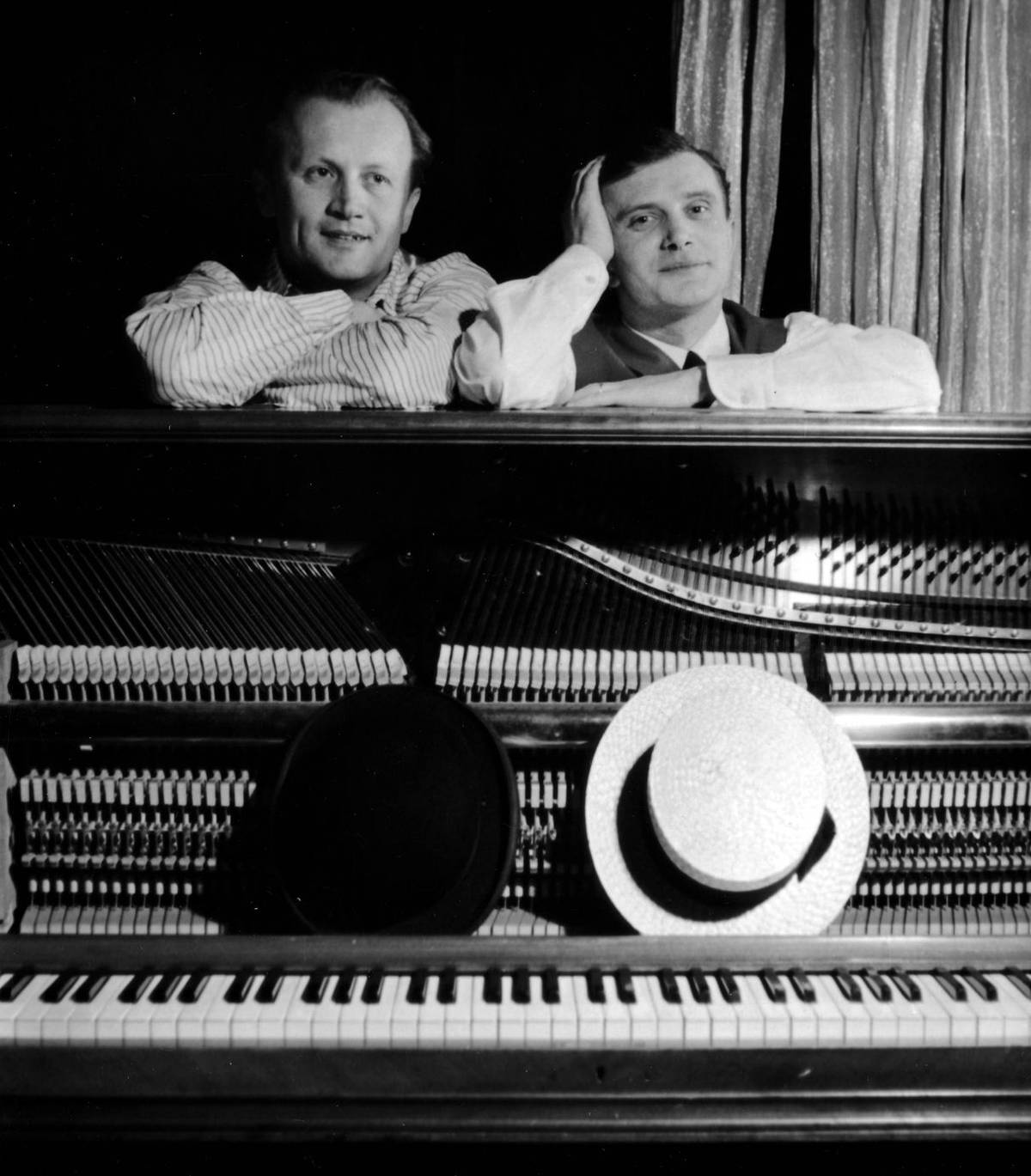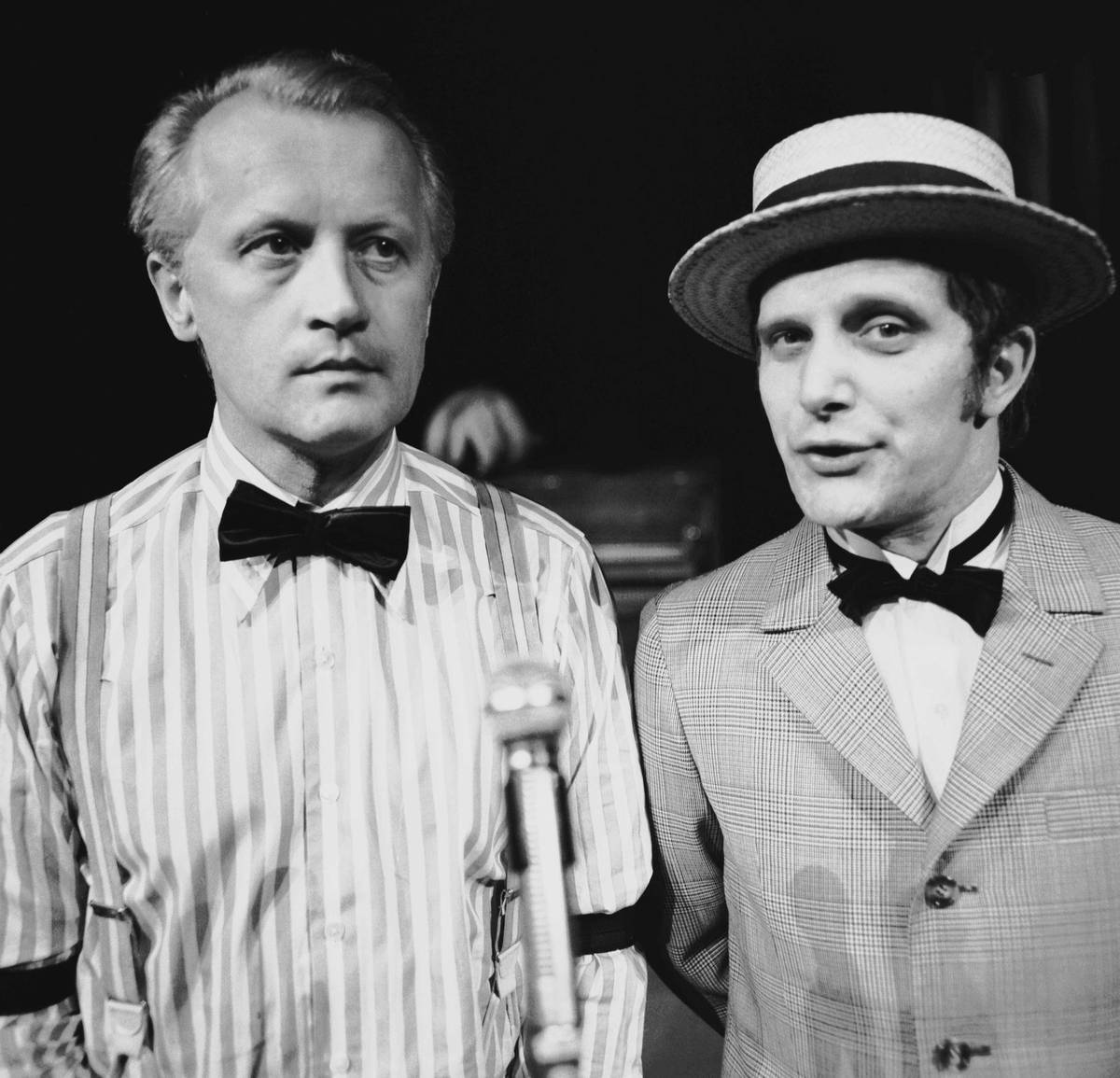 Říkali mu Doktor klavír nebo Doktor matrace, dovedl hrát virtuózně na piano. A ovládal i harmoniku, varhany, kytaru, trubku či saxofon. Své nemotornosti využil k vytvoření úspěšné image posmutnělého intelektuála s kamennou tváří, který se v buřince a šlích až komicky nehodí do šantánu, jak se říkalo zábavním podnikům kabaretního typu. Na snímku jsou Jiří Suchý a Jiří Šlitr s obřími číšemi v červenci 1966 na karlovarském festivalu.