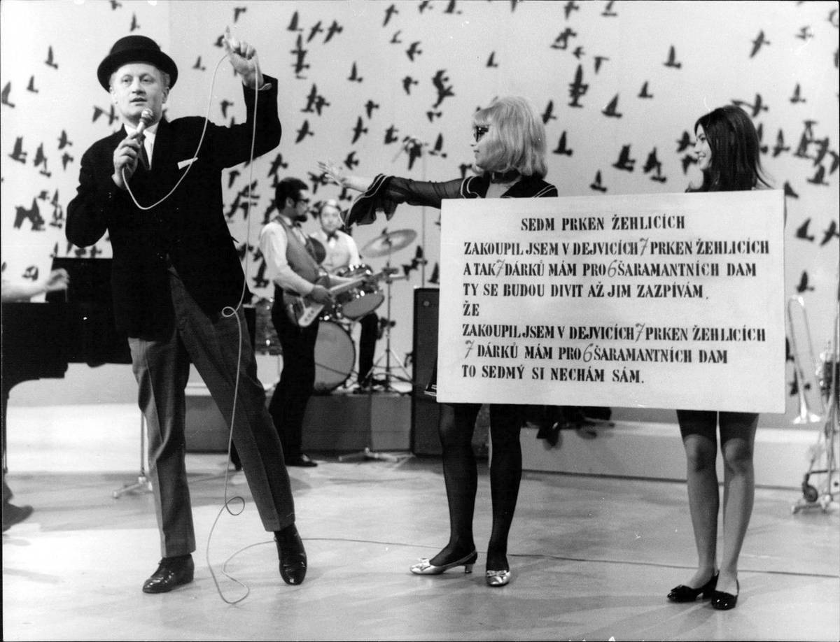 Šlitr (na snímku jako moderátor soutěže krásy studentek ekonomických škol Miss Economia) působil výrazně právě kombinací strojenosti a neobratnosti. Byl to ironický protipól suverénních bavičů, zároveň vyvažoval náladu textů Jiřího Suchého.