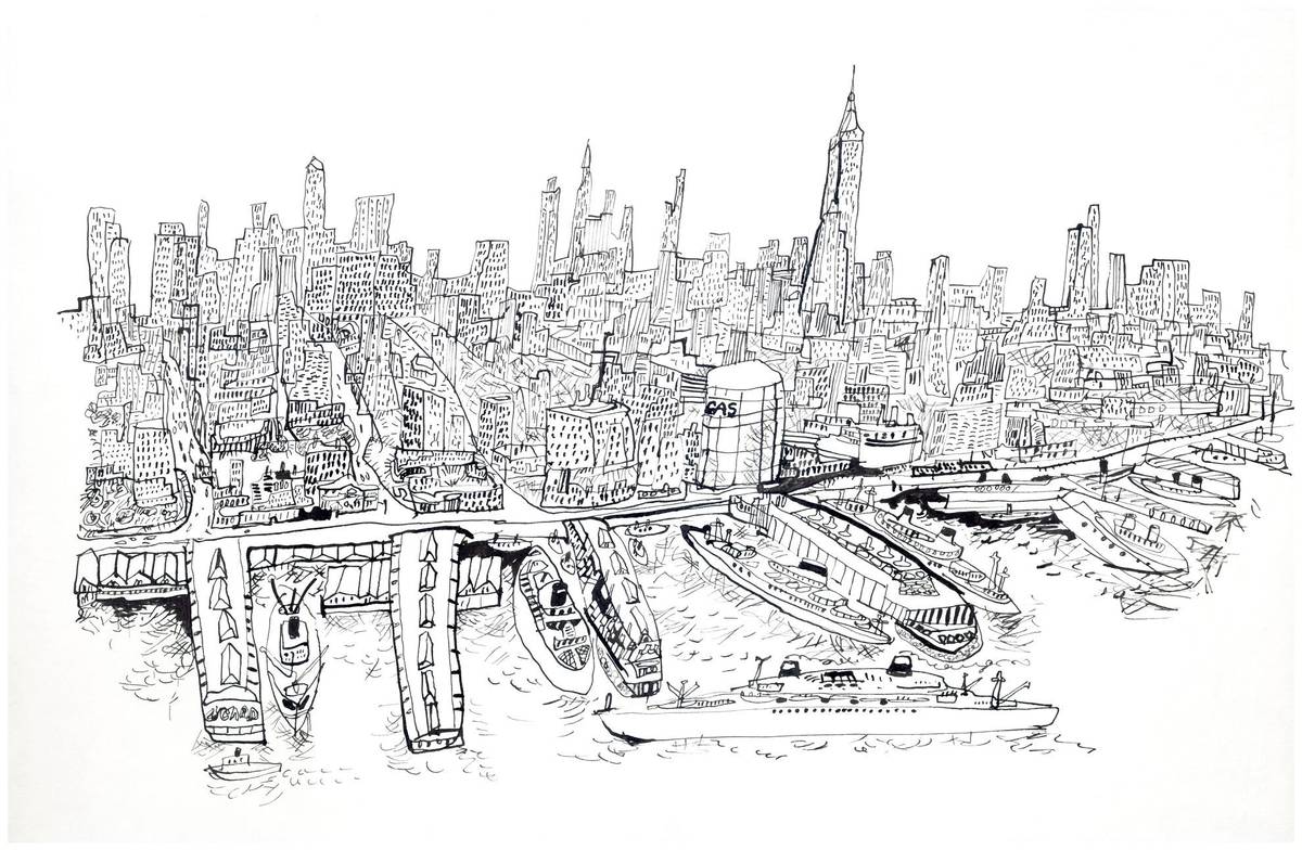 Kontakty v USA sháněl Šlitrovi exulant Jiří Voskovec, jeho vzor z éry Osvobozeného divadla. "Tahal z kapes skicáky plné oslnivě pravdivých rychlokreseb všech koutů New Yorku," popsal Voskovec svého o generaci mladšího jmenovce, kterého v dopisech oslovoval "drahý Šlitříku". Na snímku je Šlitrova kresba New Yorku.