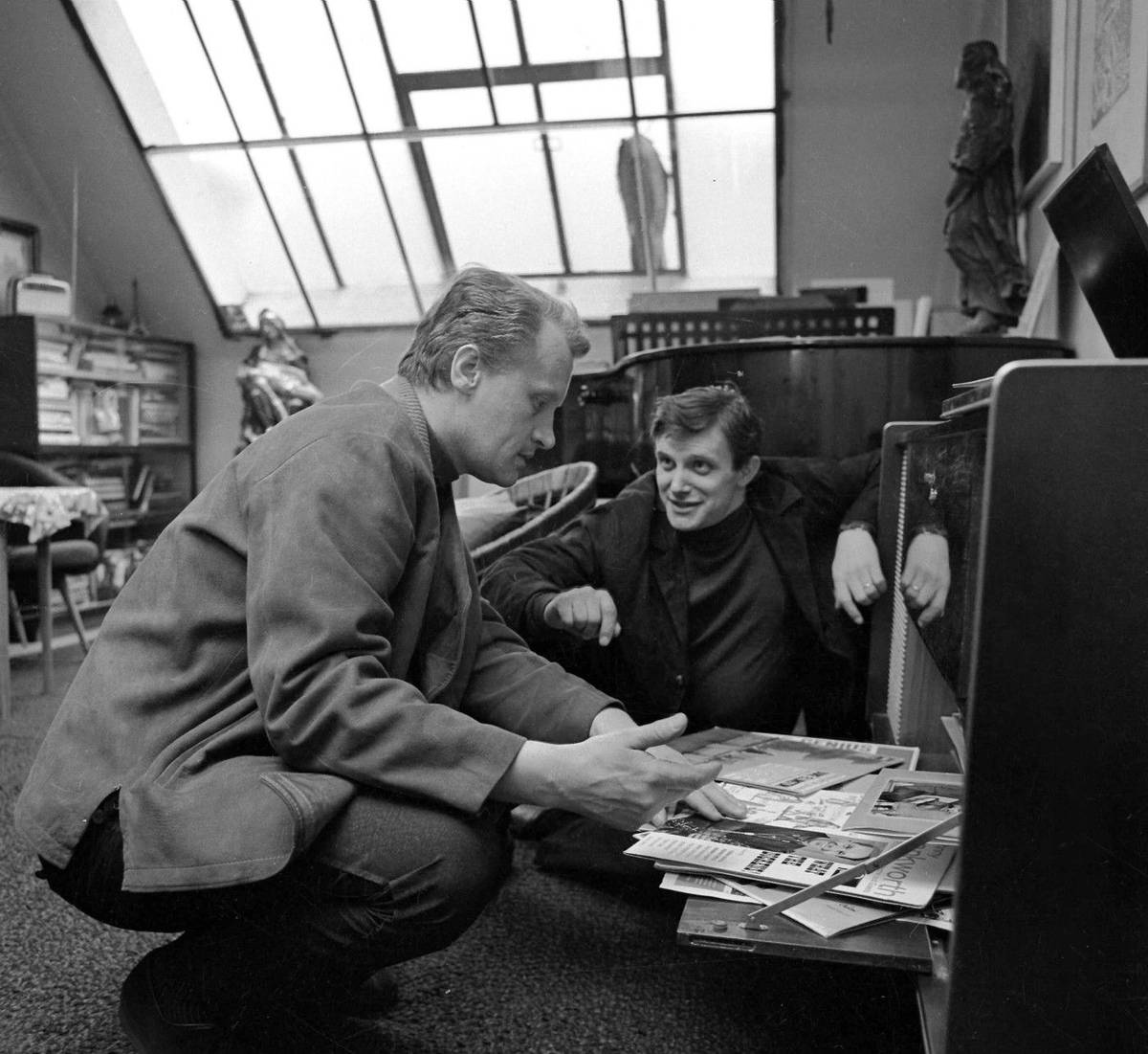 Šlitr (vlevo) také přispěl hudbou ke snímkům Miloše Formana Konkurs a Černý Petr či k debutu Věry Chytilové O něčem jiném. Ilustroval více knih včetně několikátého vydání Zbabělců Josefa Škvoreckého z roku 1968. Domluvil se německy, rusky, francouzsky i anglicky.