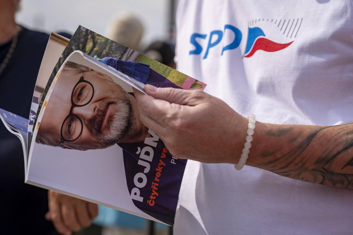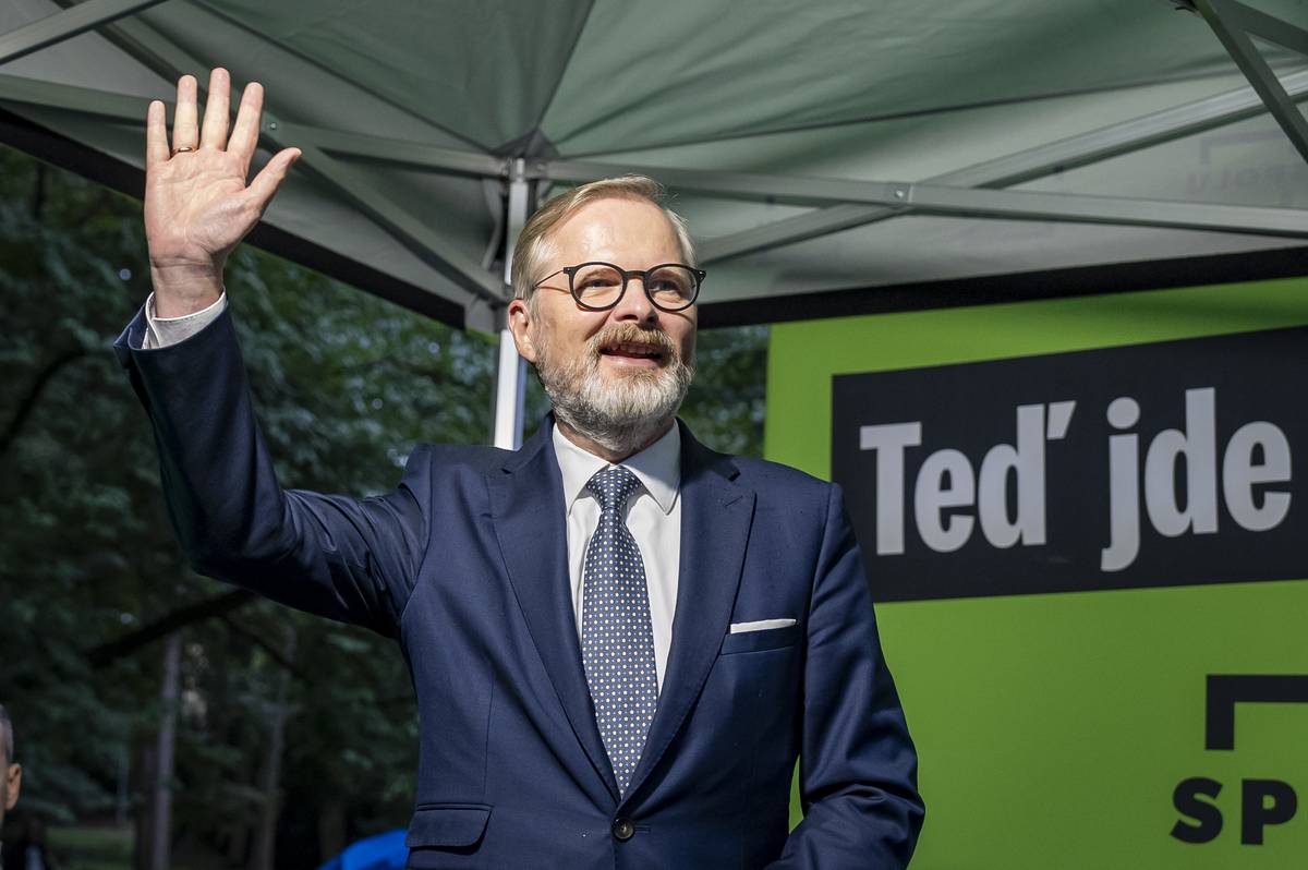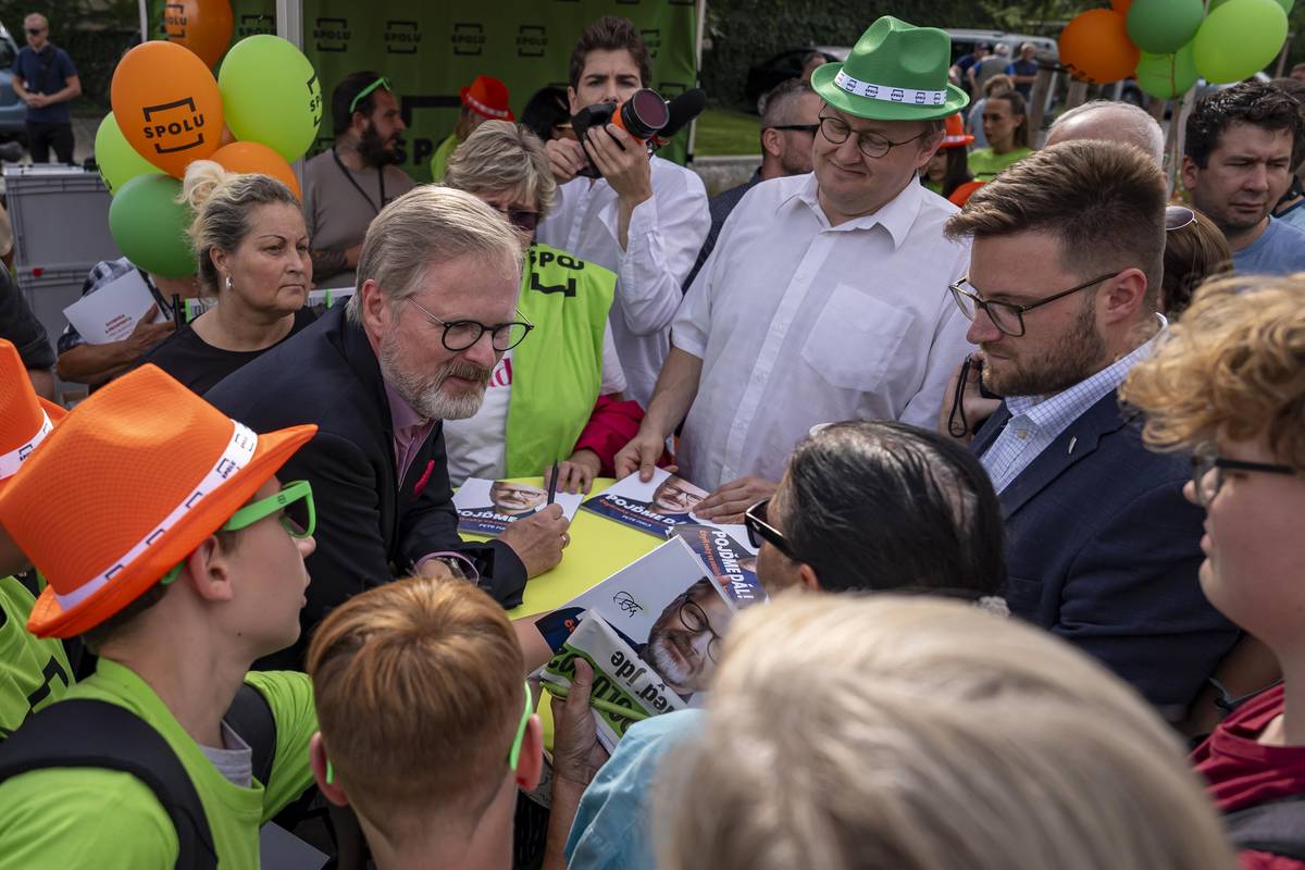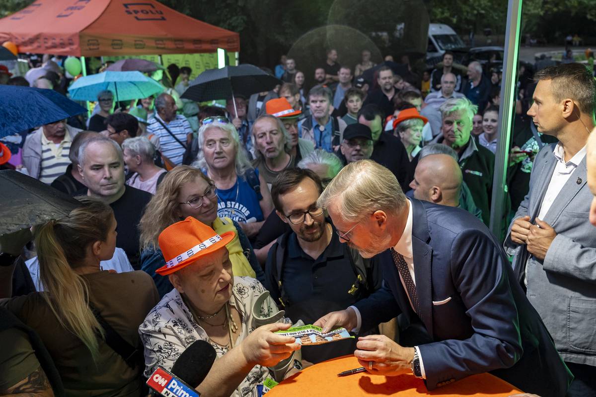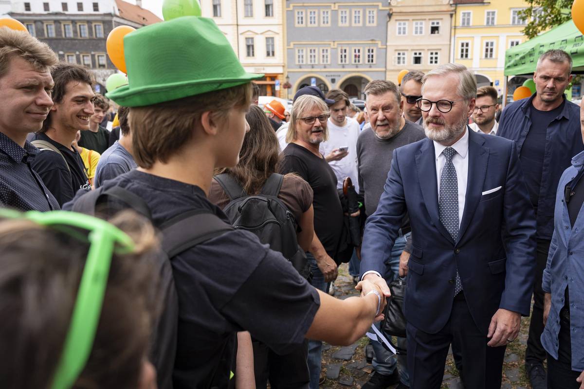 Premiér Petr Fiala na scéně. Kampaň spolu i křiklavými barvami cílí na mladší voliče.