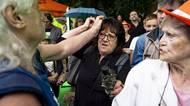 V davu došlo i na fyzický konflikt. Jeden z hlasitých odpůrců schytal ránu deštníkem, pak sám udeřil jinou ženu v davu.