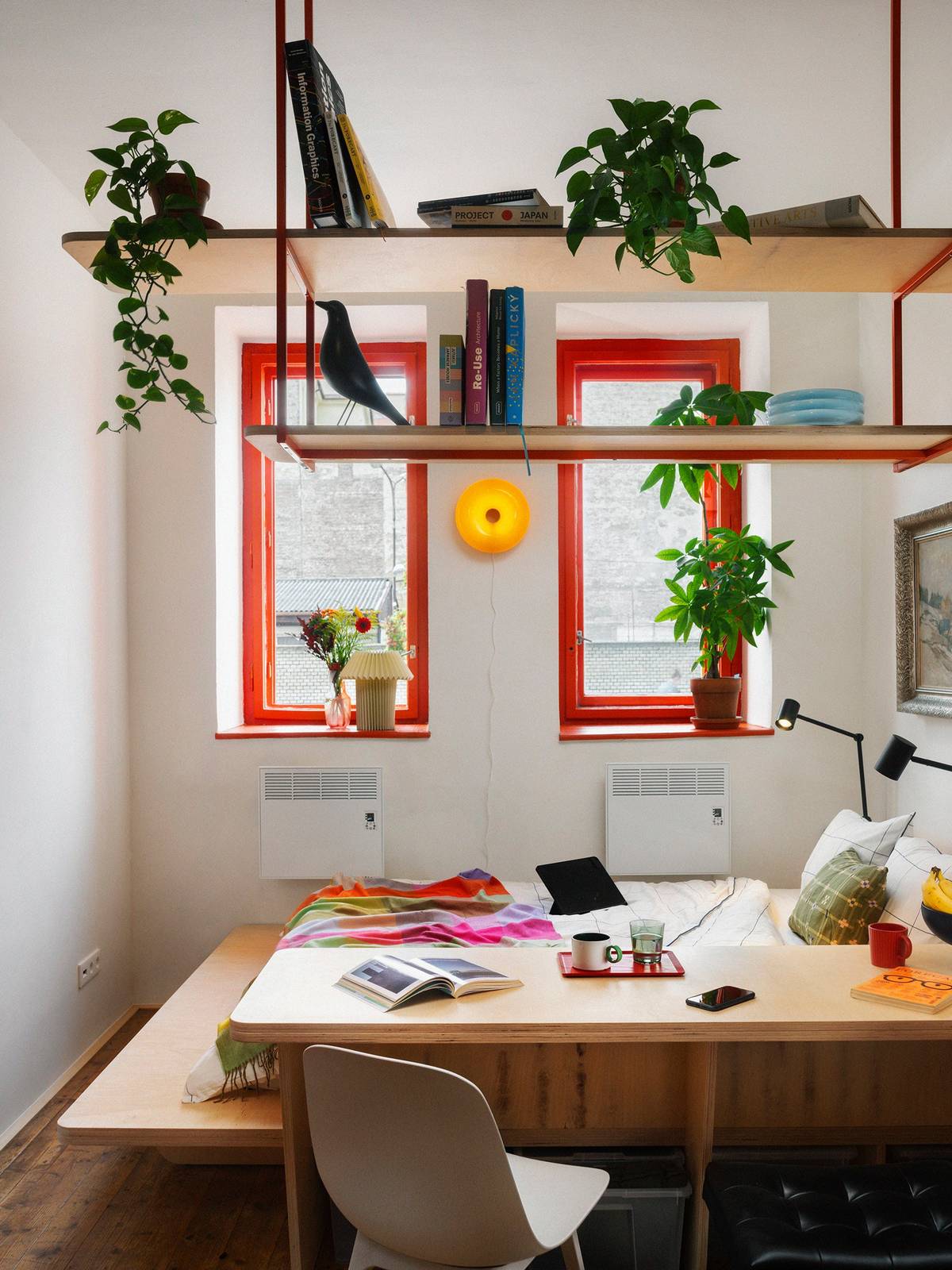 Postel a pracovní stůl v pokoji M tvoří jednotný celek.