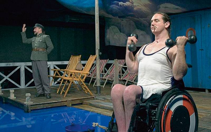 Inscenace Podivné odpoledne dr. Zvonka Burkeho s Boleslavem Polívkou a Ondřejem Vetchým se hraje od roku 1990. Toto je snímek z roku 2008.