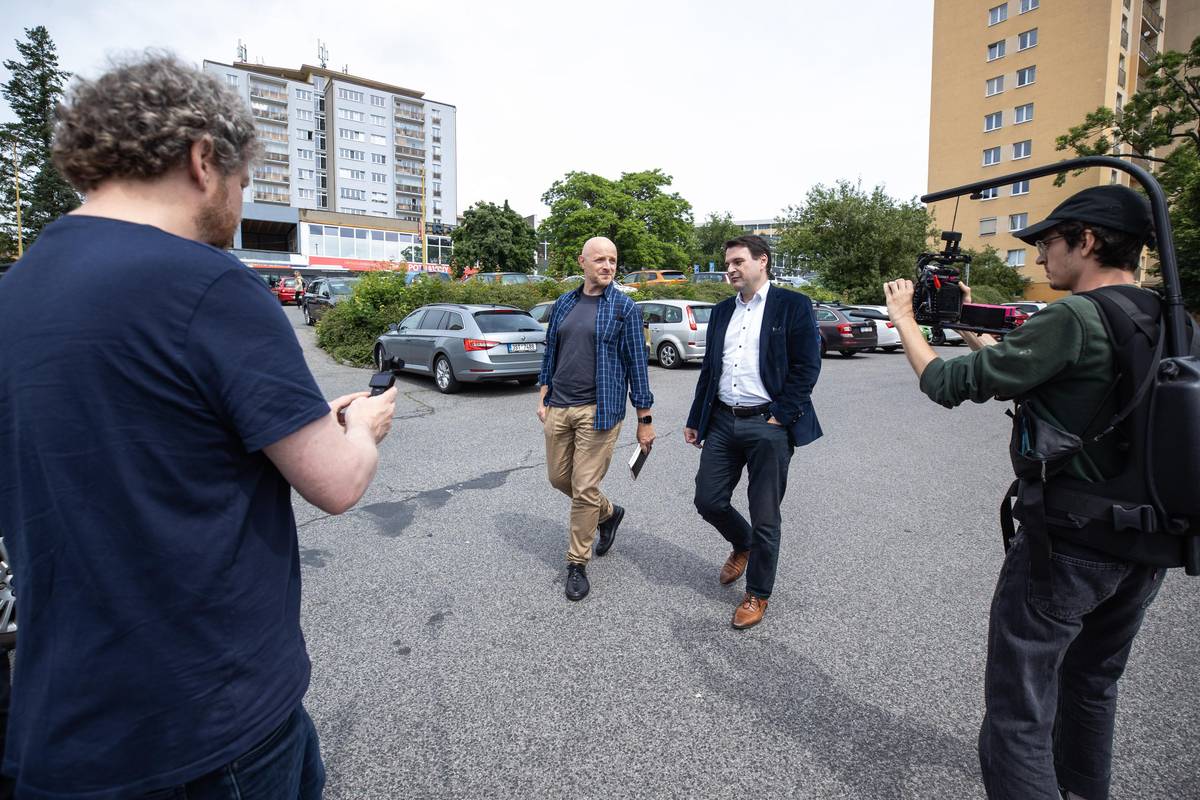 Srážku dvou světů - toho Macinkova a toho „studentského“ - po celou dobu točí filmový štáb v čele s režiséry Vítem Klusákem (uprostřed) a Filipem Remundou.