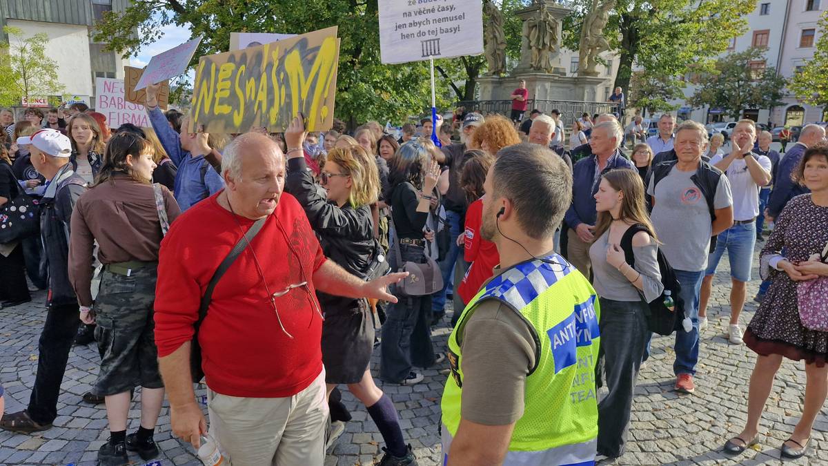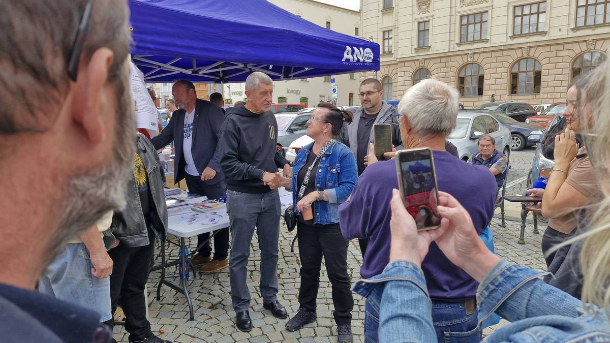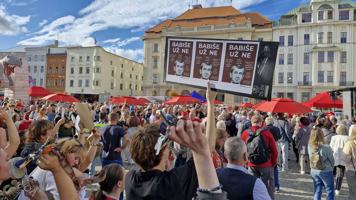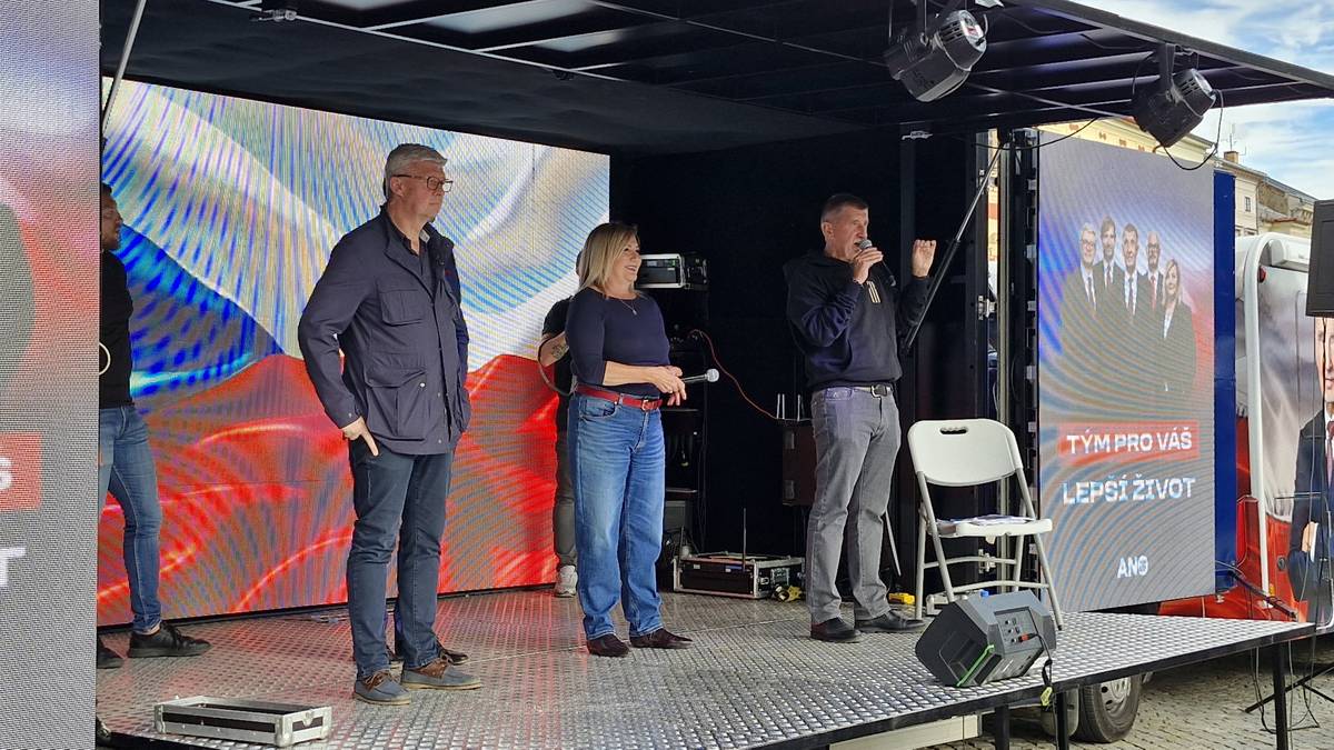 Předvolební mítink hnutí ANO v Jihlavě. Přišlo několik stovek podporovatelů, ale i antibabišovci.