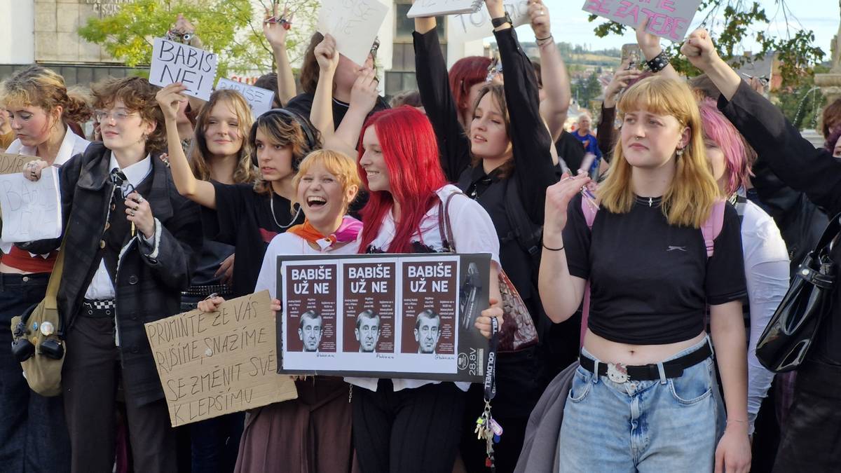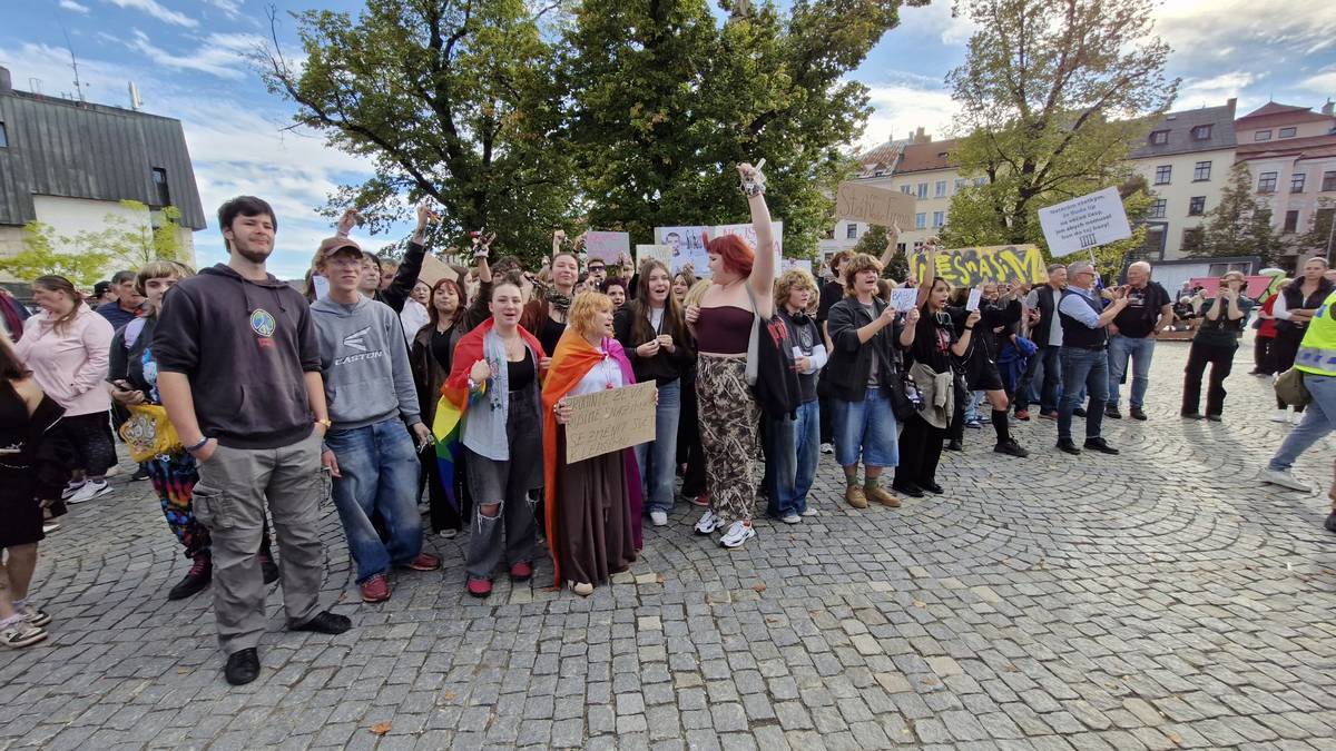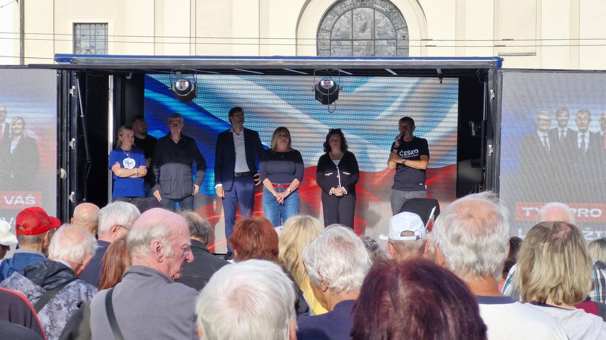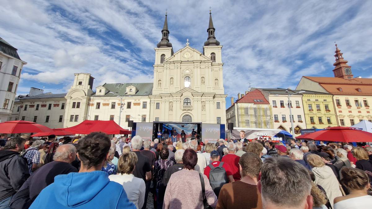 Předvolební mítink hnutí ANO v Jihlavě. Přišlo několik stovek podporovatelů, ale i antibabišovci.