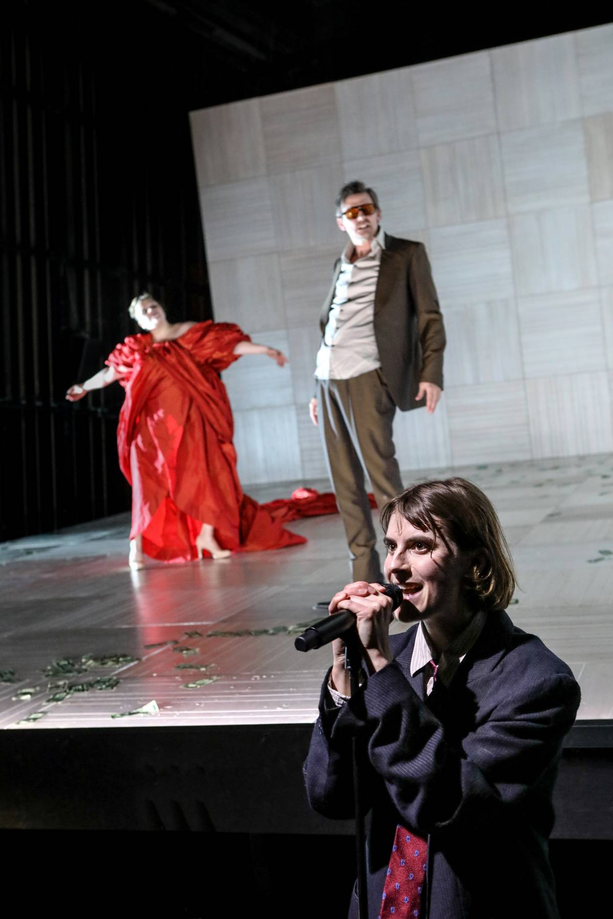 Na snímku z inscenace Svatá Johanka z jatek, kterou uvedl plzeňský festival Divadlo, jsou Nina Bruns, Stefanie Reinsperger, Kathleen Morgeneyer a Amelie Willberg.