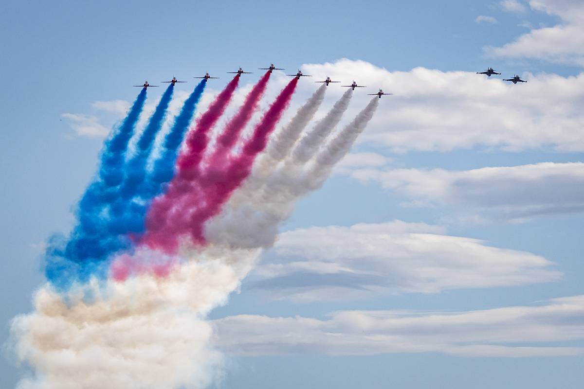 Stíhačky Armády ČR Jas 39 Gripen a 9 letounů BAE Hawk T1 akrobatické skupiny Red Arrows