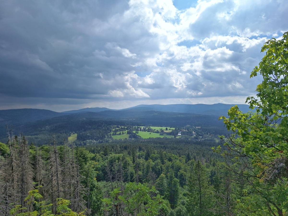 Ze Stožecké skály dohlédnete na Třístoličník, Trojmeznou horu či Plechý.
