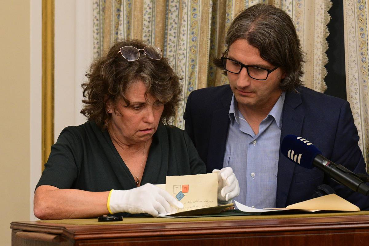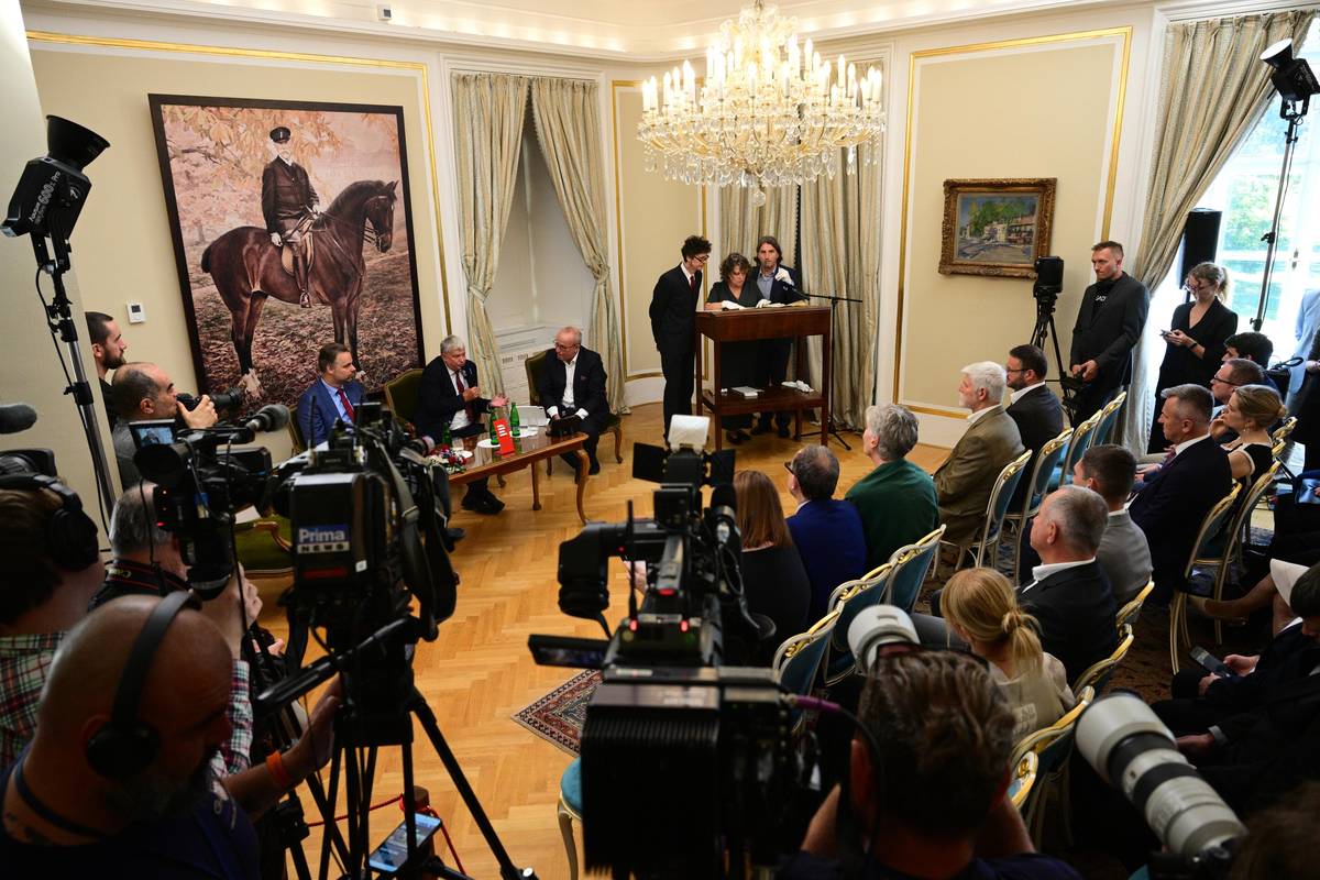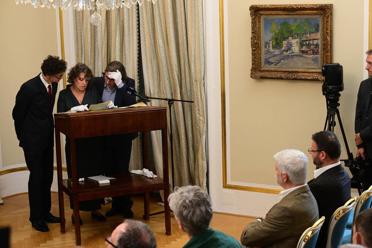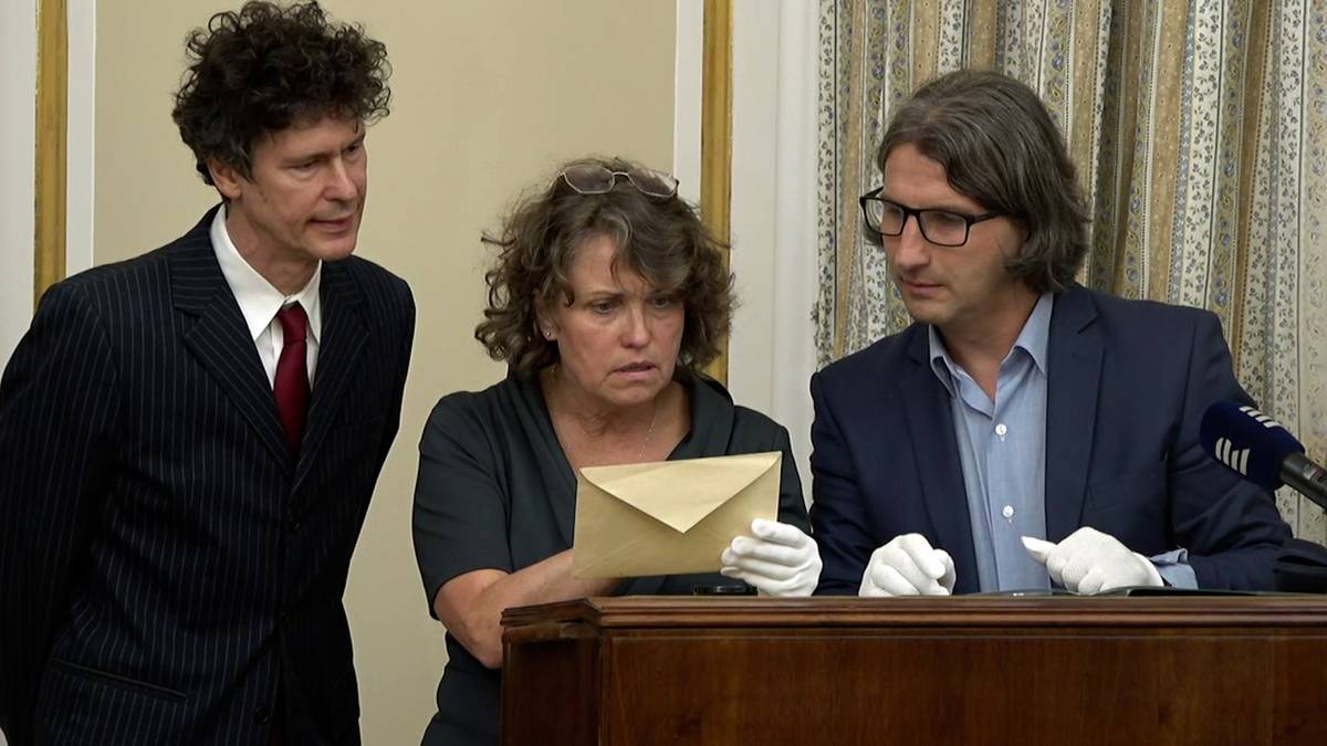 <p>Otevření zapečetěné obálky s údajně posledními slovy Tomáše Garrigua Masaryka, které nadiktoval v září 1937 svému synu Janovi, 19. září 2025, Lány.