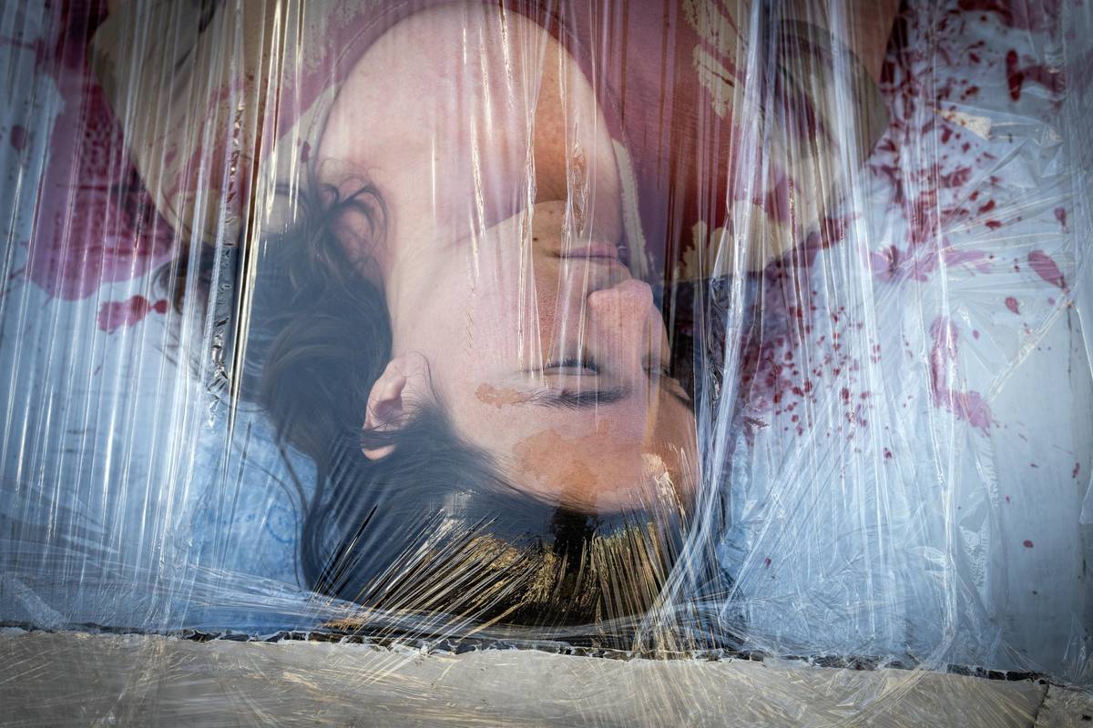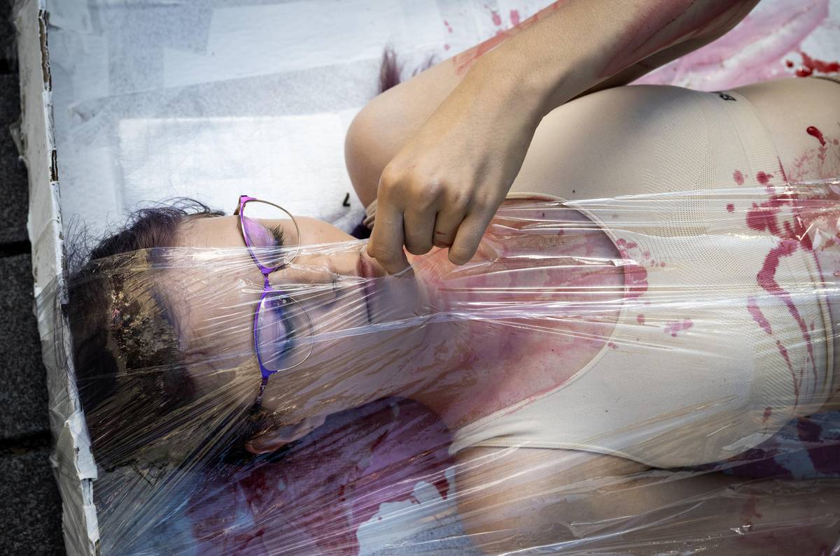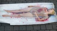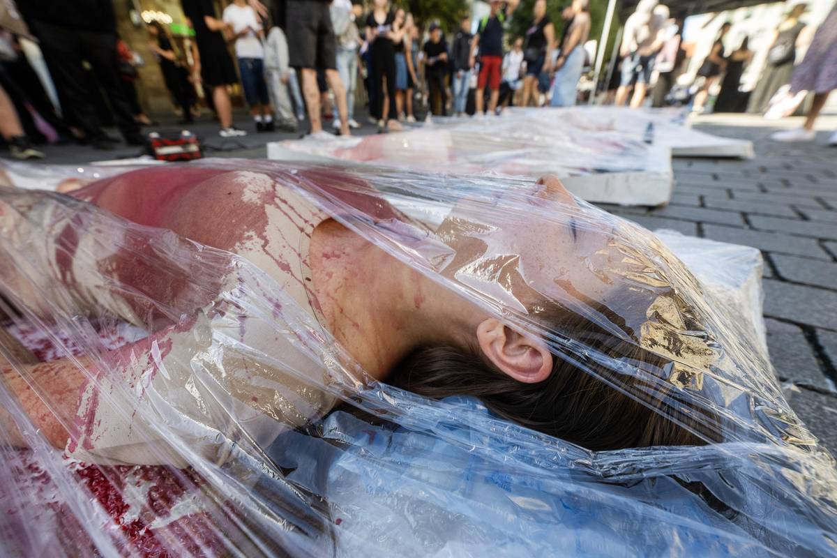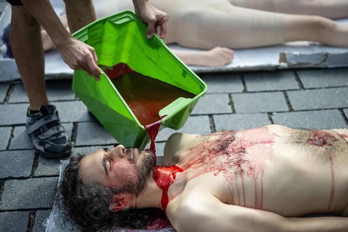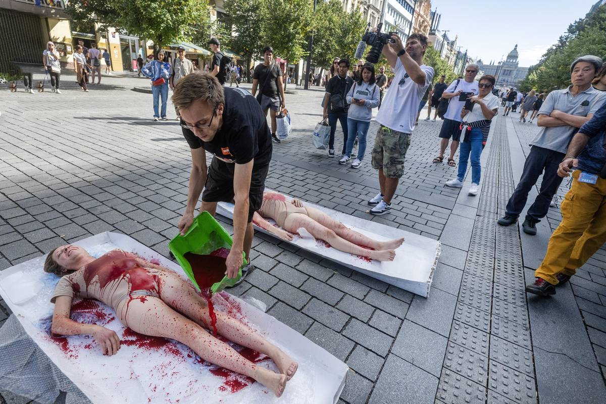 A pak je jeden z účastníků akce polil červenou tekutinou připomínající krev.