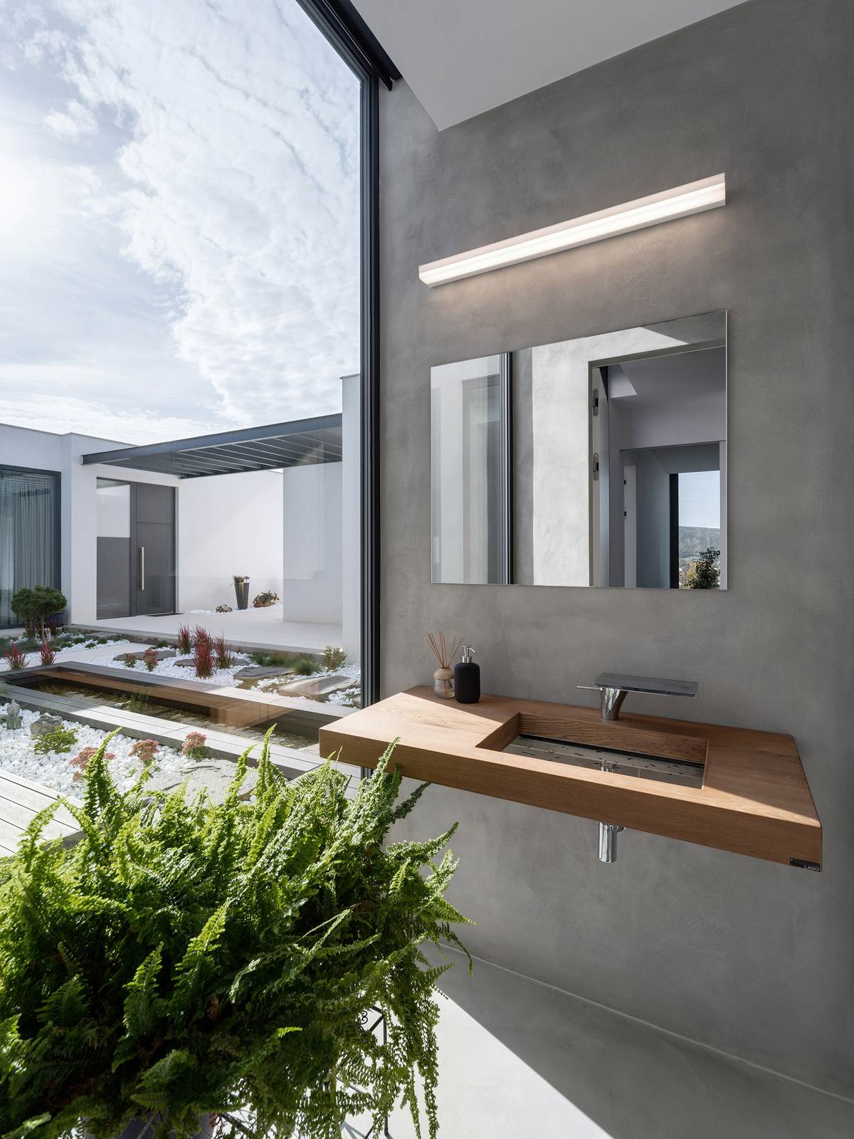 Koupelna v rodinném domě má velkorysé prosklení. Díky tomu lze krásně pracovat s živými květinami. Neutrální základ ve formě stěrek je doplněn pouze výraznějším dřevěným umyvadlem.