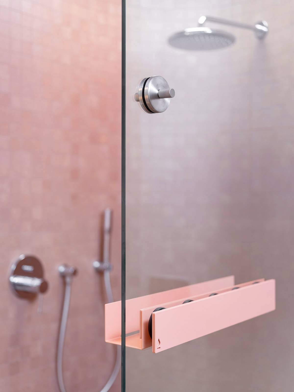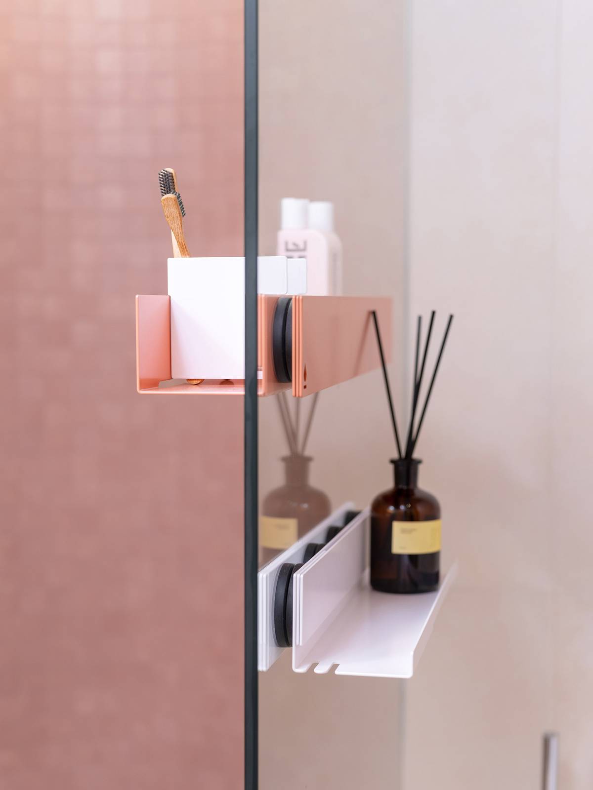 Variabilní uspořádání magnetických polic Be_myshelf. Jedna je umístěna směrem do sprchy, druhá slouží pro odložení difuzéru směrem k toaletě.